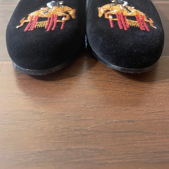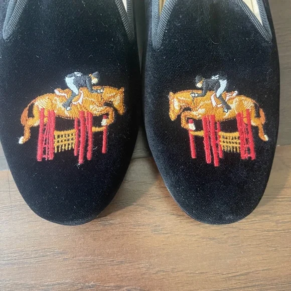 Stubbs & Wootton Women´s Velvet Equestrian Slippers Loafers Shoes Sz 7 EUC!This is a beautiful steeplechase, horse jumping, equestrian needlepoint design on black velvet. It...