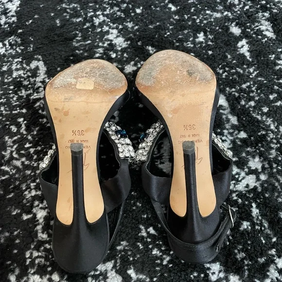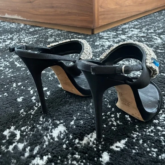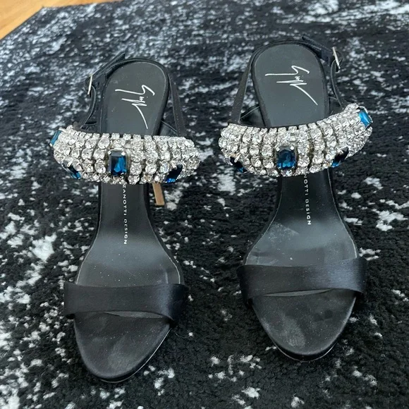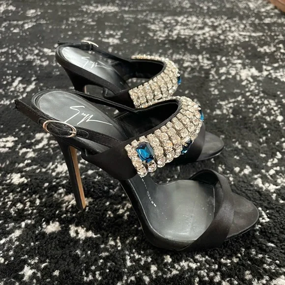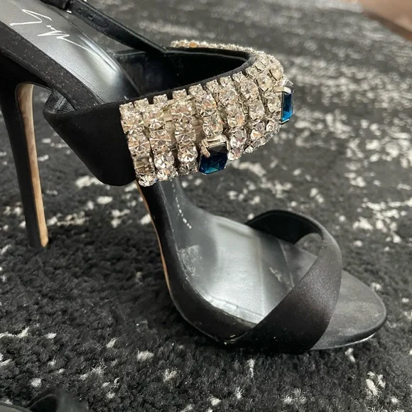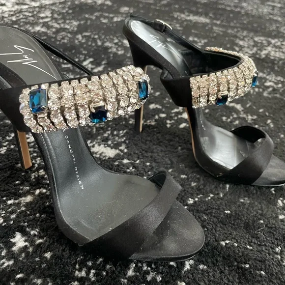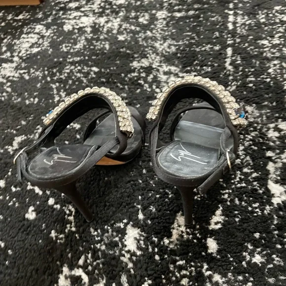 Guiseppe Zanotti Carine Black satin heels with crystal embellished band. In really excellent condition. Besides for wear on the bottom, the shoes look really great. No scratches on satin. Just missing one small crystal but hard to even see it.