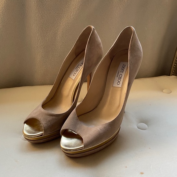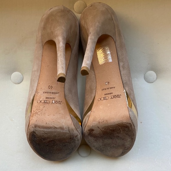 Jimmy Choo Pumps $259Size 40 EU (9 US) No box or dust bagWorn (only a couple of times) but in good condition Beige suede with gold leather details Willing to negotiate