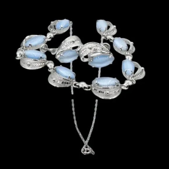 Beautiful Alice Caveness Sterling Silver SetMid-Century circa 1950´sScrew Back Earrings 1" longNecklace 17"Moonstones set in sterling filigree settingSigned on back
