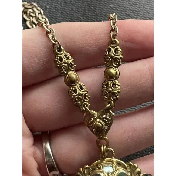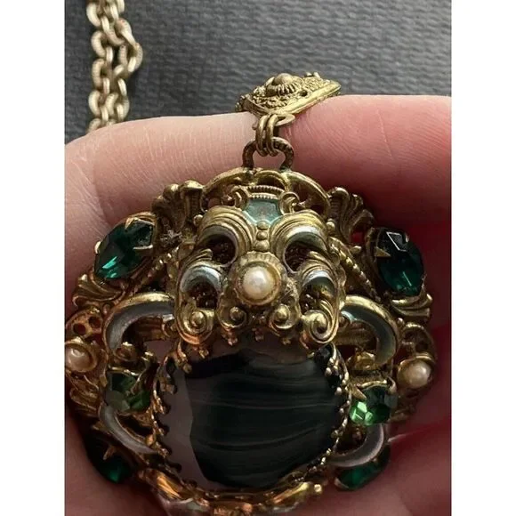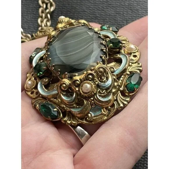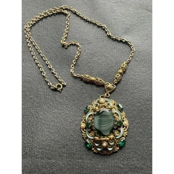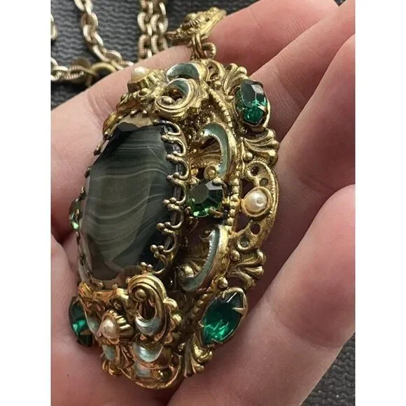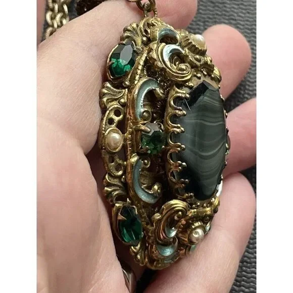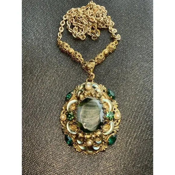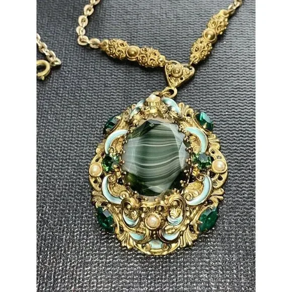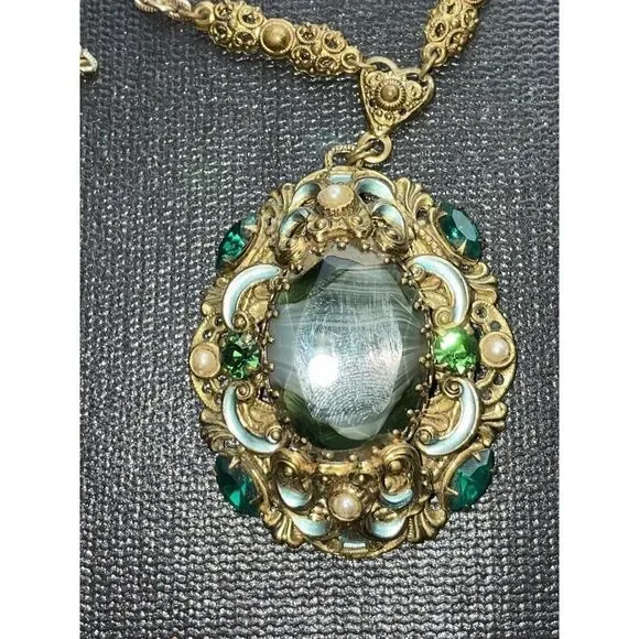 Vintage WEST GERMANY Necklace Green Rhinestone Faux Pearl Stone Filagree Ornate