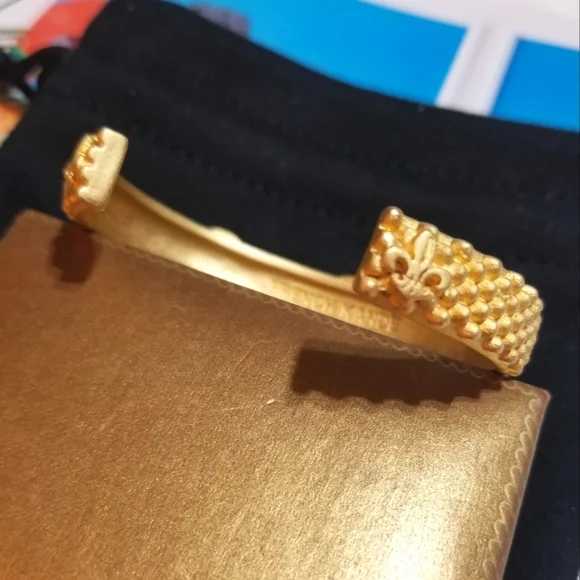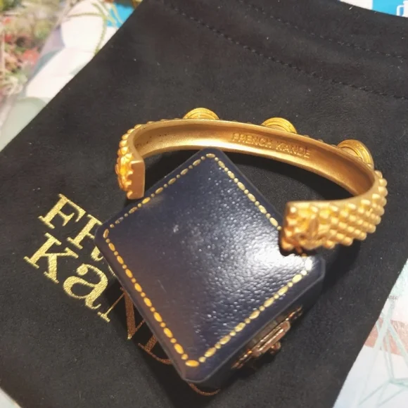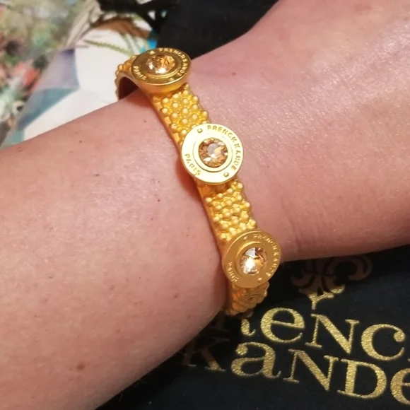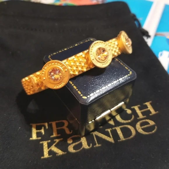 French Kande is an Iconic vintage inspired jewelry line created by Los Angeles based designer Kande Hall. Her collections feature vintage French medallions from the 1960s discovered during her travels throughout France. This Exquisite Cuff Bangle Bracelet has 24kt Overlay and European Cut Austrian Pink Crystals. The French Medallions read "French Kande Paris". Today, French Kande is sold in over 600 high end specialty boutiques across the country. This Particular Bracelet is no longer available in her line so, you´ve found it here. The opening is 2 & 3/8" across and fits a Small or Medium size wrist Comfortably. The widest point (Medallions) measure 1/2" across. This Treasure will add an Elegant Touch to any outfit and is versatile enough for any occasion. Item F23.I´ve been in Vintage/Antique jewelry for over 35yrs and I sell some new items occasionally. Feel free to ask questions.MY LISTINGS GENERALLY CONSIST OF MANY ONE OF A KIND OR VERY RARE PIECES, SOLID 14KT ITEMS, PLATINUM, 18KT, DIAMONDS, AMETHYSTS, TOPAZ, AGATE, EMERALDS, SAPPHIRES, OPALS, STERLING SILVER, VINTAGE AND ANTIQUE PIECES, BOLD AND RUNWAY-ERA. DESIGNERS SUCH AS GIVENCHY PARIS NEW YORK, CHRISTIAN DIOR FRANCE, FENDI ITALY, VALENTINO, KENNETH JAY LANE, , ALEXIS BITTAR, YVES SAINT LAURENT, HENRI BENDEL, HERMES, JUDITH JACK, KATE SPADE, MICHAEL KORS, MIRIAM HASKELL, CORO,PRADA,HERMES,.