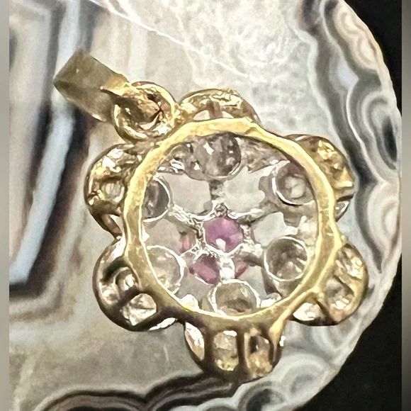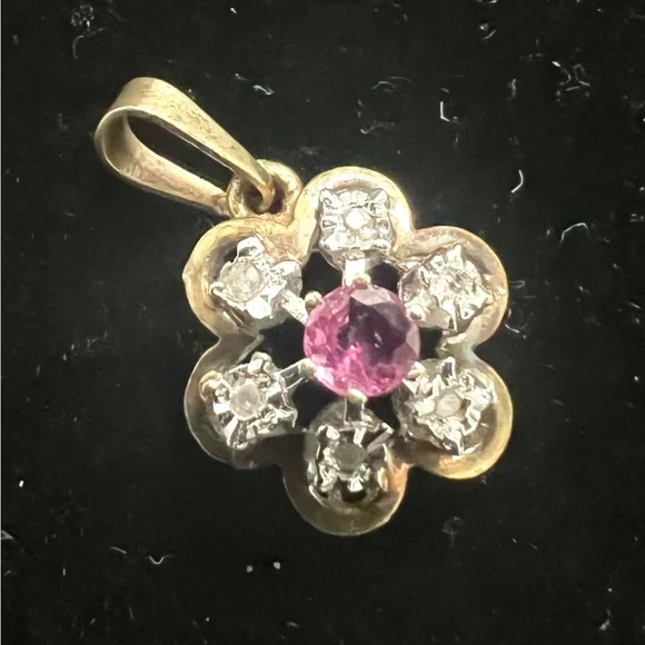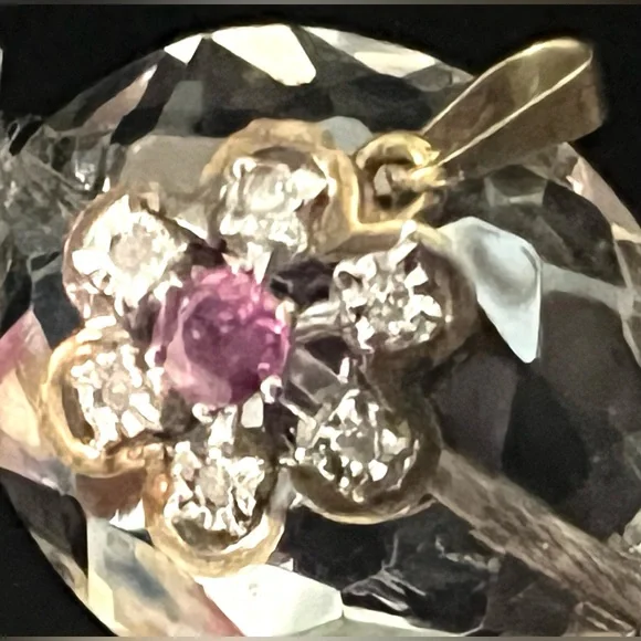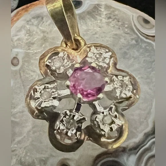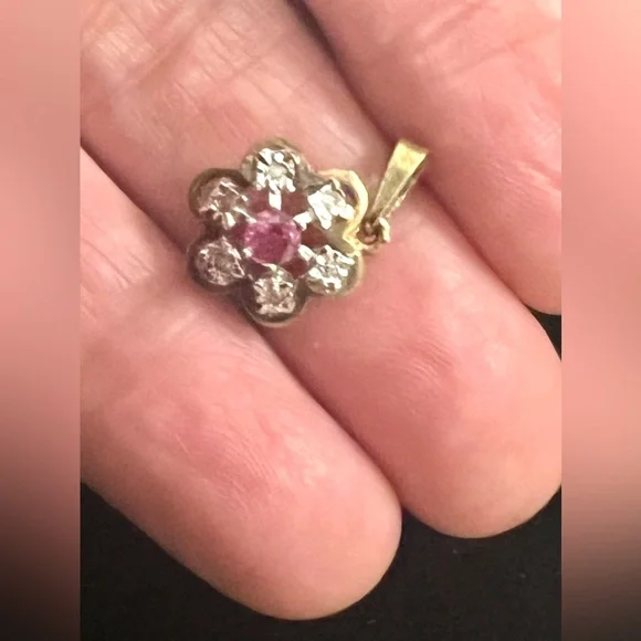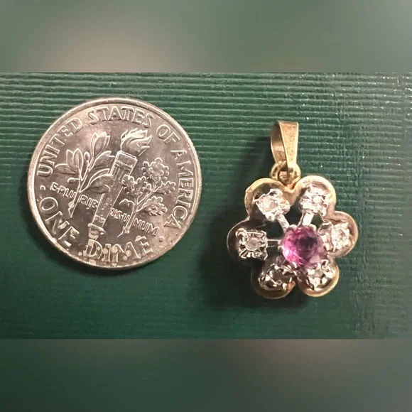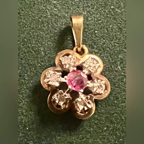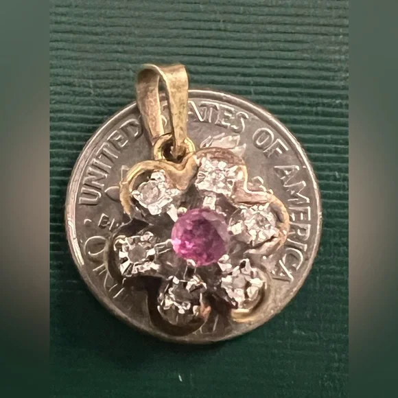 14K Yellow Solid Gold Ruby/6Diamonds Flower Pendant