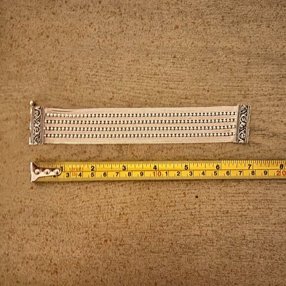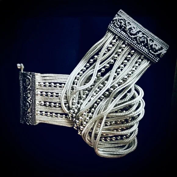 Handcrafted in Petra Jordan -Solid 925 Sterling Silver Bracelet - wide profile bracelet- delicate features - heavy solid 925 silver- ornate clasp- unique design- measures 7"l x 1.5"w- stackable or wear alone- brand new in box- great price - pls ask questions