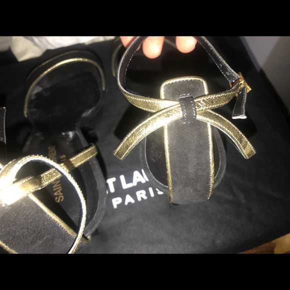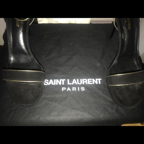 Saint Laurent Janis Simple Ankle Strap Sandal in Black Suede and Metallic Gold$950 MSRPBrand New Unused Comes with box and dustbagBlack suedeGold leather pipingAdjustable ankle strapLeather lining and sole4.5" heel, 1" platformMade in ItalyPlease let me know if you have any questions, or would like to negotiate pricing. Thanks!