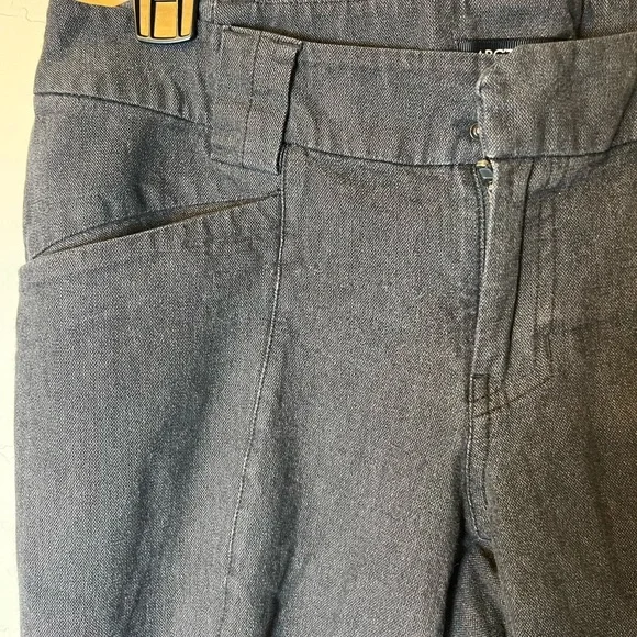Arc’teryx Wool-Blend Trim Fit Pants for women in good used condition. Natural cotton and wool blend fabric with a textured surface, comfort stretchFixed waist band with belt loops and hidden snap center closureArticulated knees, gusseted crotch for comfort and mobilitySeam detail down front of leg provides slimming effect