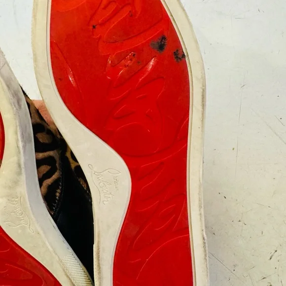 From Christian Louboutin, these animal print slides with his signature red soul are extremely comfortable, casual, yet crazy cool. His shoes generally run small. In excellent condition.