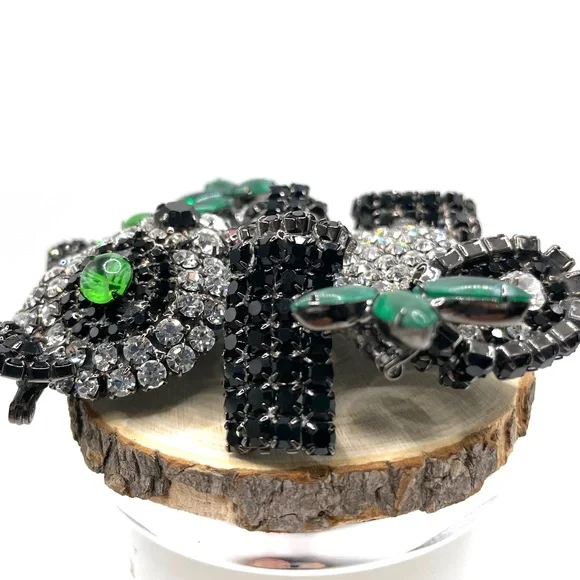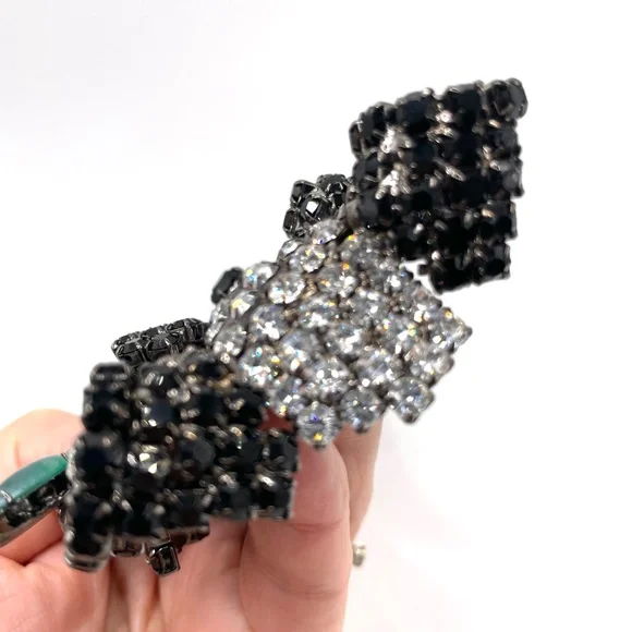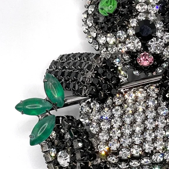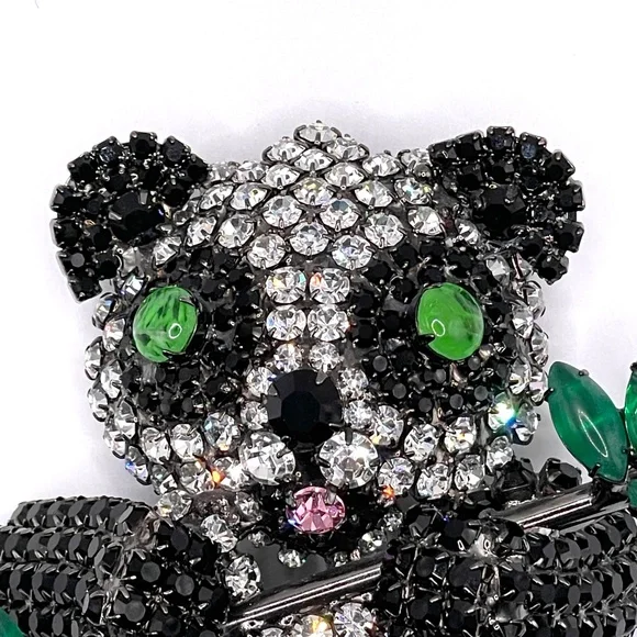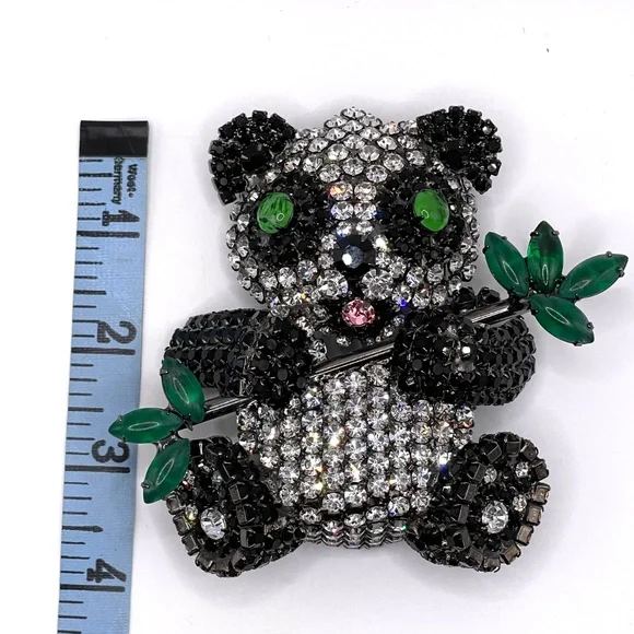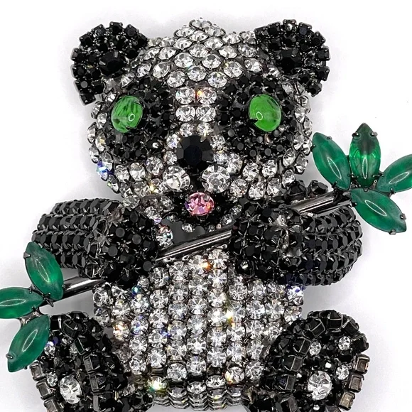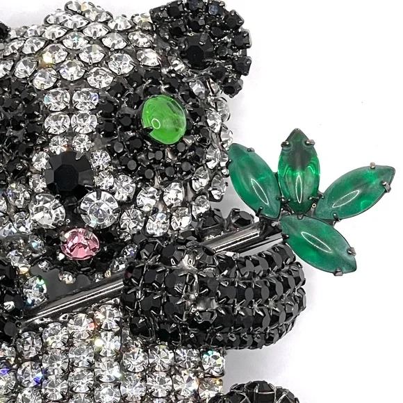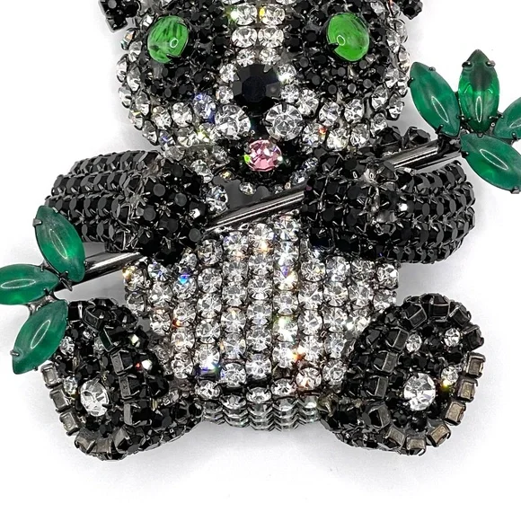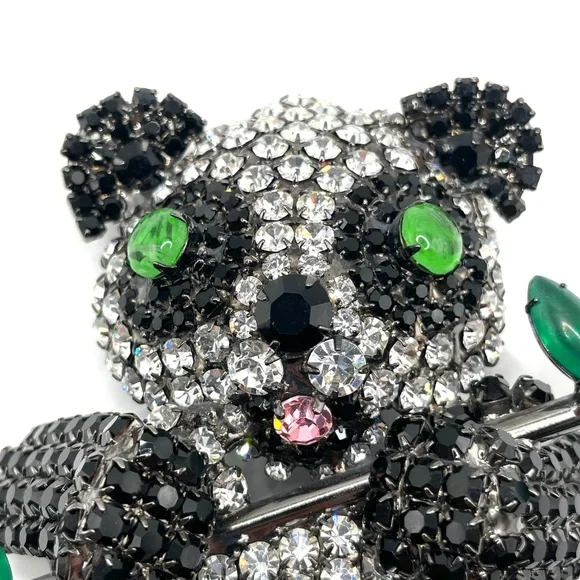 Moans Couture signed black, white and green rhinestone panda bear statement pin brooch -- large -- about 4". Christopher Crouch designs under the Moans brand.See this information...