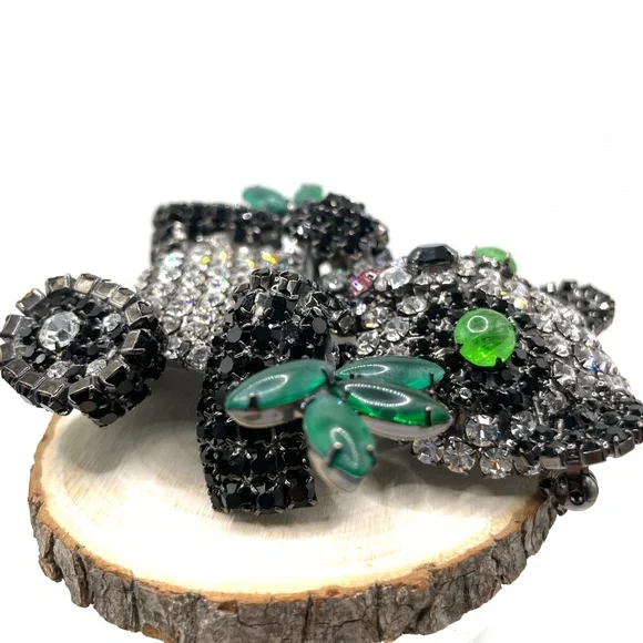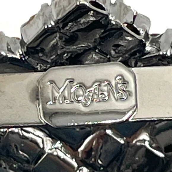 Moans Couture signed black, white and green rhinestone panda bear statement pin brooch -- large -- about 4". Christopher Crouch designs under the Moans brand.See this information from WorthPoint about his designs:https://www.worthpoint.com/dictionary/p/jewelry/-american/moans-couture"Each piece of Moans jewelry is designed and crafted by Crouch in his New York workshop. He incorporates unique elements, such as colorful glass beads, faces, leaves, and large cabochons, into his designs."This is a sizable and weighty brooch.It will need to be worn on a sturdy garment -- like a jacket or coat.Sweet sparkly bear is holding a branch of bamboo and has a pink rhinestone mouth and green glass eyes. All stones are prong set and present.And boy do they sparkle!Japanned back. Clasp works as it should. My camera doesn´t come near to doing this one justice.It´s a statement for sure.Stunning!Pre-owned.