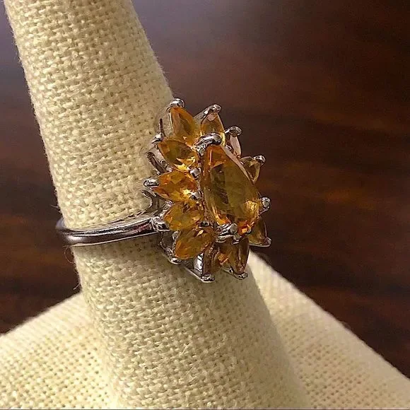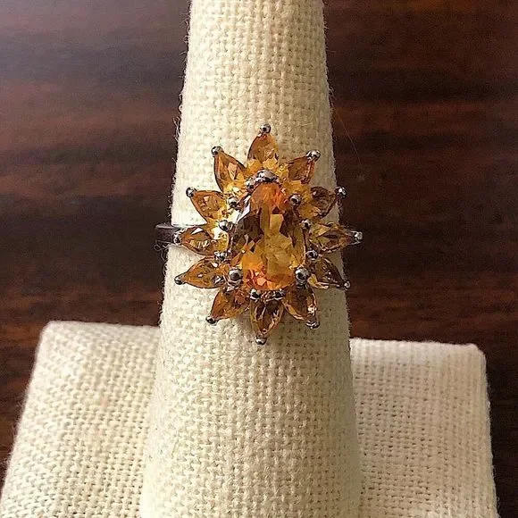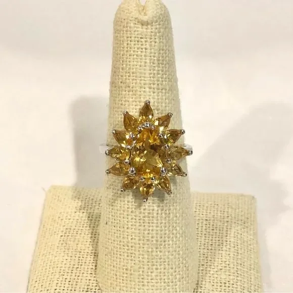 Sterling Silver Faceted Golden Citrine Flower Shaped Ring Sterling Silver Gemstone Ring With Stunning Floral DesignFaceted Golden Citrine Oval Center GemSurrounded By Marquise Shaped Faceted Citrine GemstonesMarked: 925, Sterling SilverSize: 7, SizableBeautiful Golden Citrine RingNew ConditionSterling Silver Hand PolishedAsk Questions and/or Request Additional Photos, Measurements as NeededColor May Vary Based Upon Shadows, Lighting, Monitor, Display Settings $325