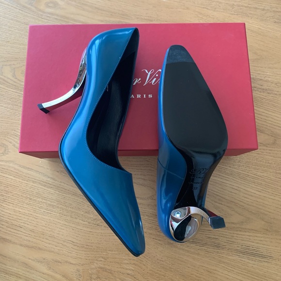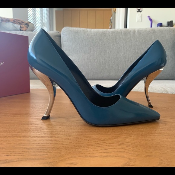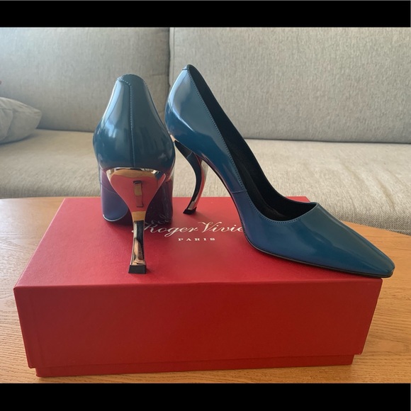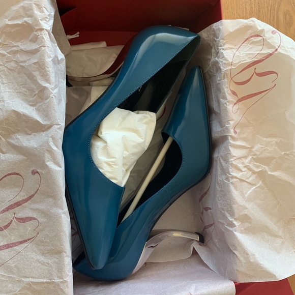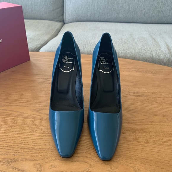 BRAND NEW NEVER WORNUnique jeans blue color. Fits a bit large for me so I have to let them go.. :(Pumps, heel height 3.25 inch (8.5 cm)Patent-leatherSquare toeSlip onLeather soleMade in ItalyComposition 100% LeatherSize: Italy 38