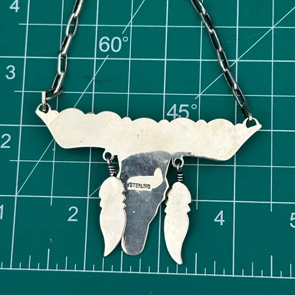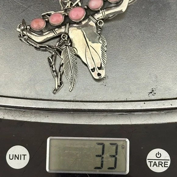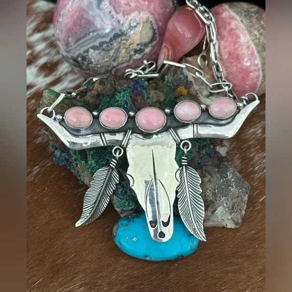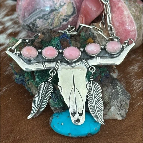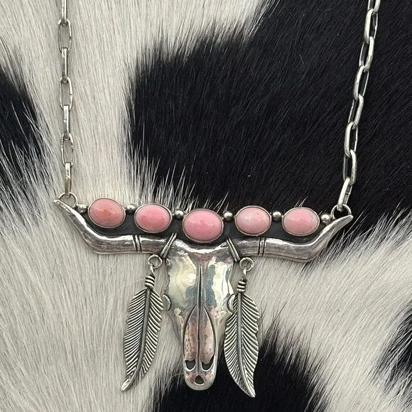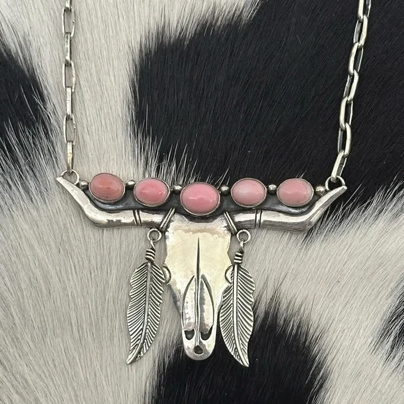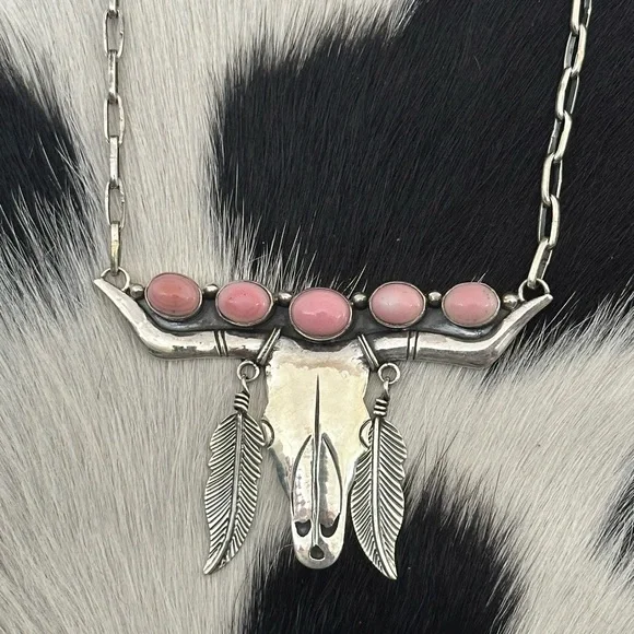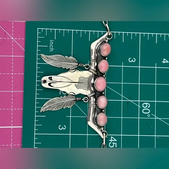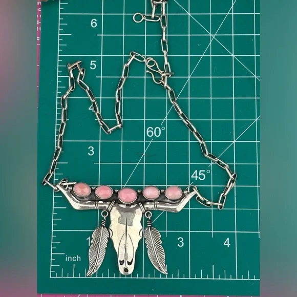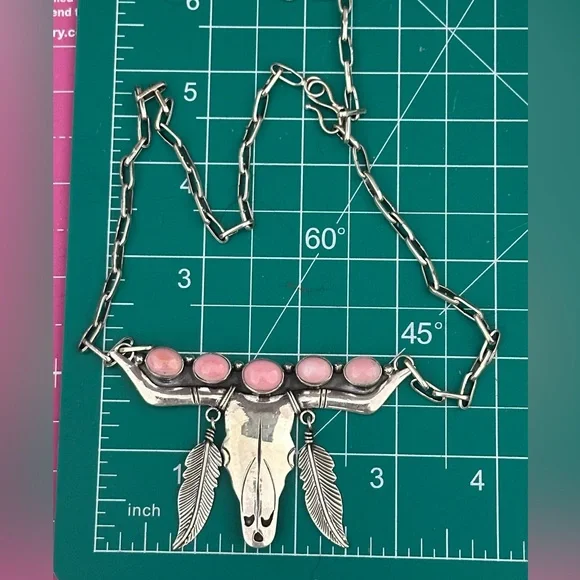 This necklace adjust to your neckline to whatever you like it situated but starting at approximate 22 inches and you can make smaller due to the paper clip chain . The longhorn is fabulous. Very long antlers. But the beautiful feathers that dangle down gives it that even extra special touch. Guarantee 925 sterling silver mind you that is including the 3 inch long long hornincluded in the necklace length. Decorated with five beautiful pink conch stones. S closure Guaranteed 925 sterling silver. Stunning unique piece . New 33 g