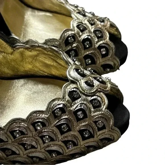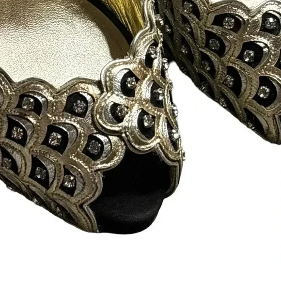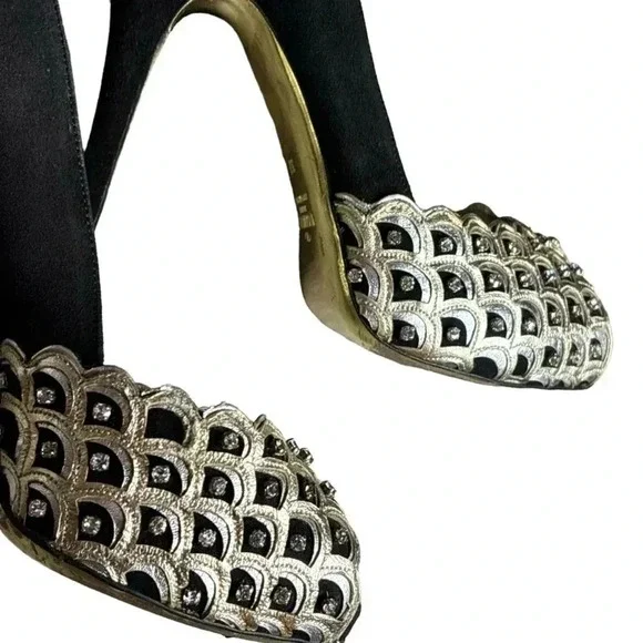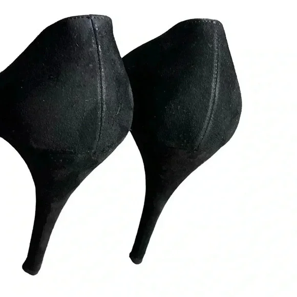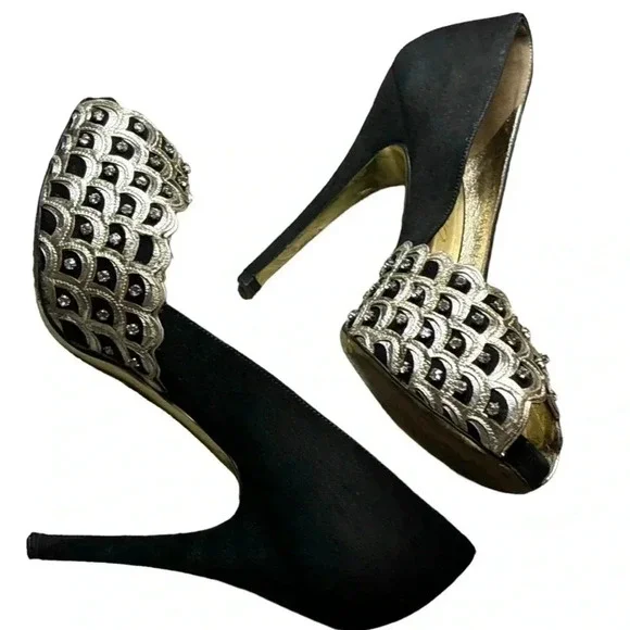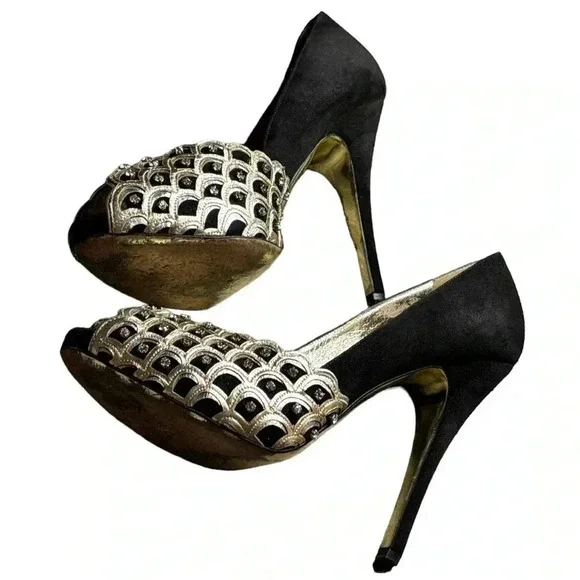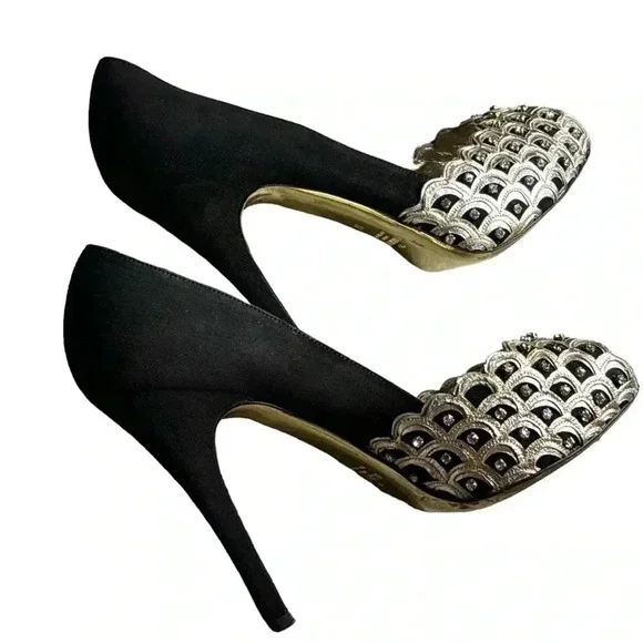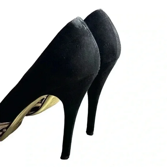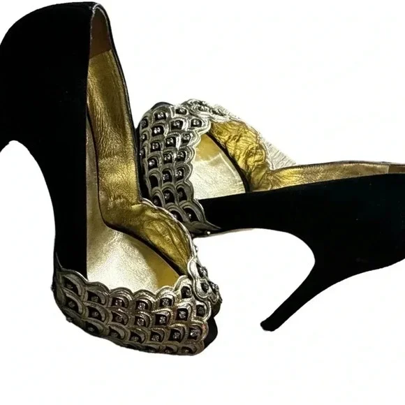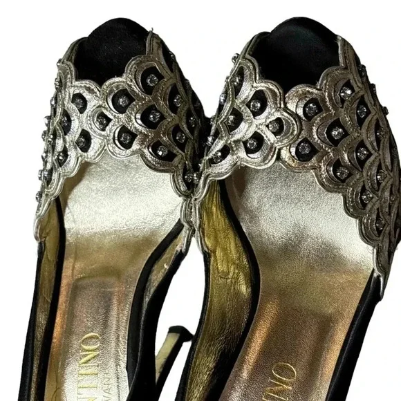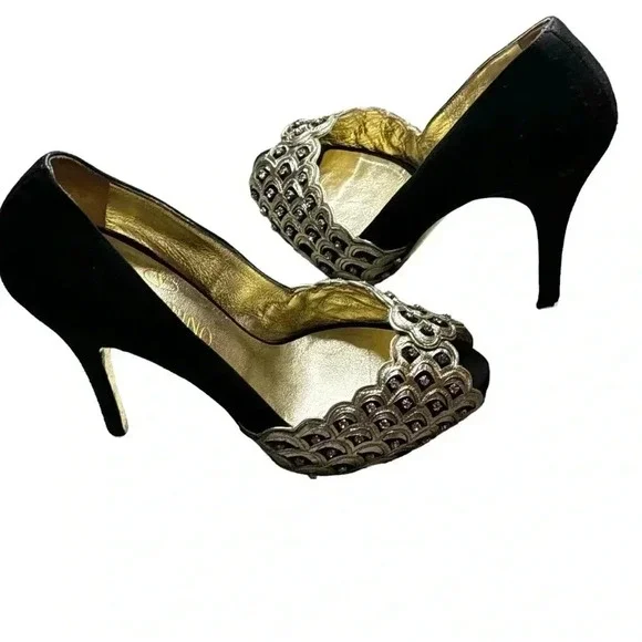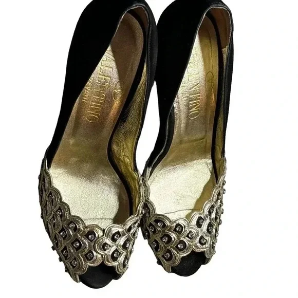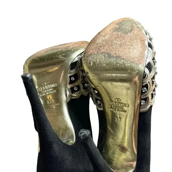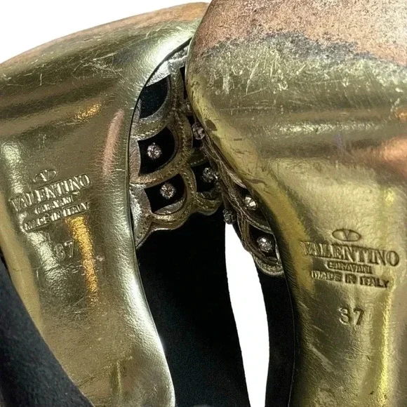 One minor flaw to suede on back top of left shoe. See last photo. Minor flaw to leather on interior logo left shoe. **These shoes are in excellent condition, but they are preowned. Please view all photos carefully for any minor flaws or imperfections before purchasing. Feel free to reach out to me for additional information or pictures. Offers are always welcome!!Valentino Garavani Italy Jeweled Black Suede Swarovski Crystal 5" Platform Pumps 37Special edition. Absolutely STUNNING- no longer available- these are a RARE find in this condition. Size 37 (US 7) Platform 1/2", total heel 5"..Black Suede body and heel with gold scalloped edge leather and clear white Swarovski crystal detailing on front. Gold bottoms, open toe front..Made in Italy- purchased full retail, almost $2,000. Valentino Suede PumpsBlackColorblock PatternLeather TrimPeep-Toes with Crystal EmbellishmentsPlatformDesigner Fit: Pumps by Valentino typically run a half size small.