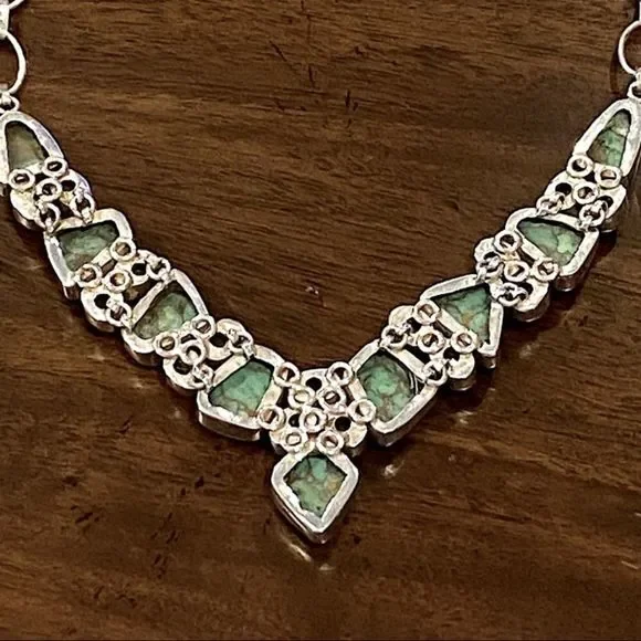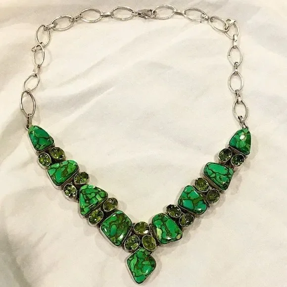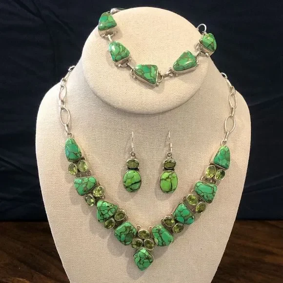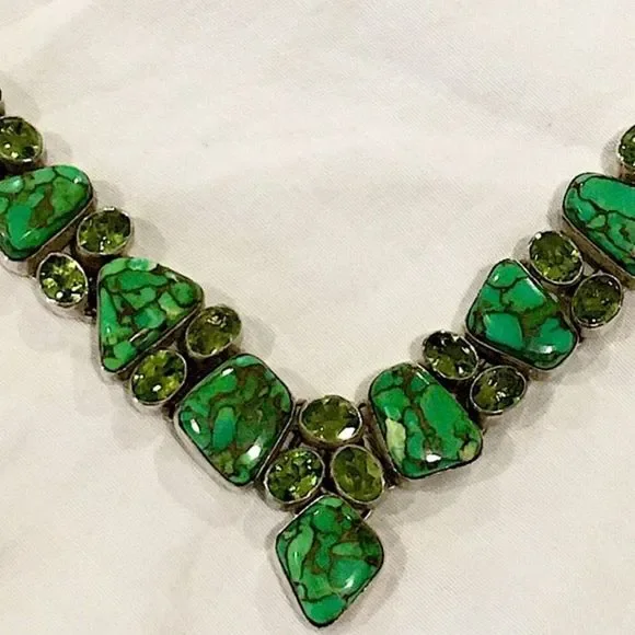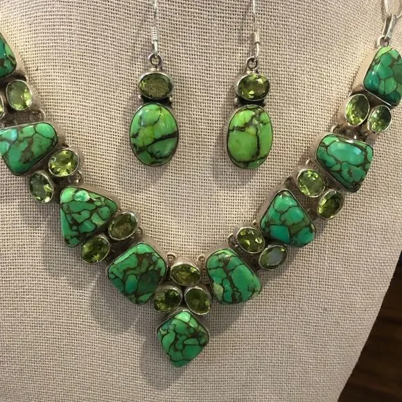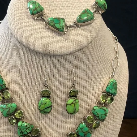 Mohave Lime Green Copper Infused Turquoise Peridot Sterling Silver 925 Necklace Copper Infused Green Mohave Turquoise & Green Peridot Sterling Silver NecklaceSterling SilverLobster Claw ClaspMarked 925Mohave Lime Green Turquoise Infused with CopperOval Faceted Green PeridotApproximately 18” longArtisanal Piece. Hand Created. Coordinating Mohave Lime Green Copper Infused Sterling Bracelet & Earrings Showed Here For Convenience But Listed Separately.Bundle & Save On Shipping Fees.Color May Vary Based on Lighting, Shadows, Display or Monitor SettingsAsk Questions and/or Request Additional Photos, Measurements as Needed$325