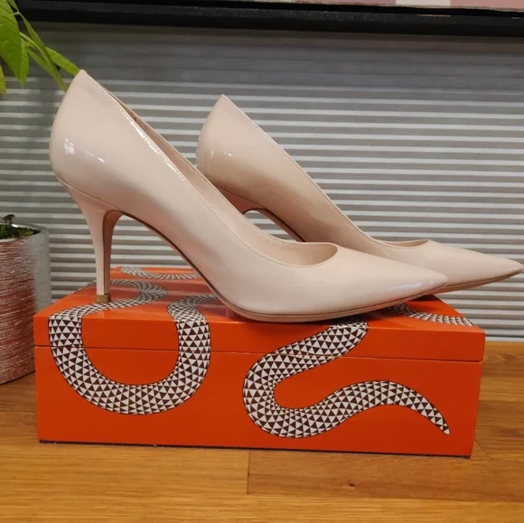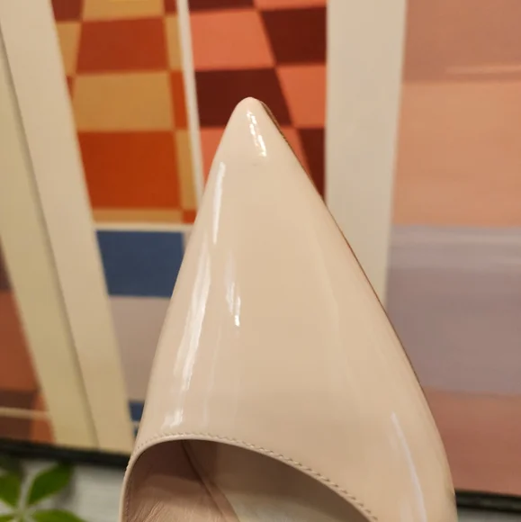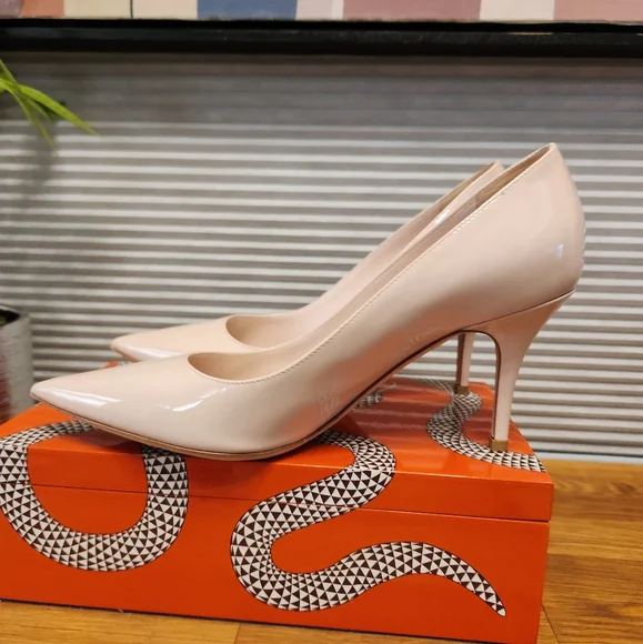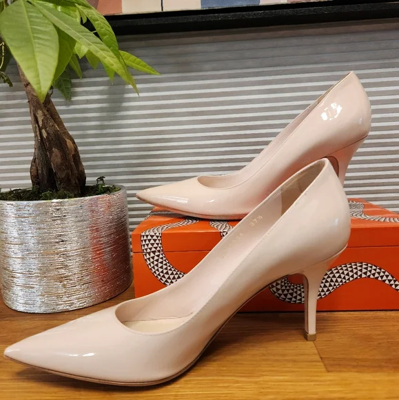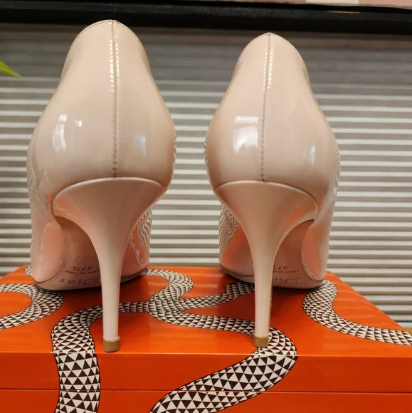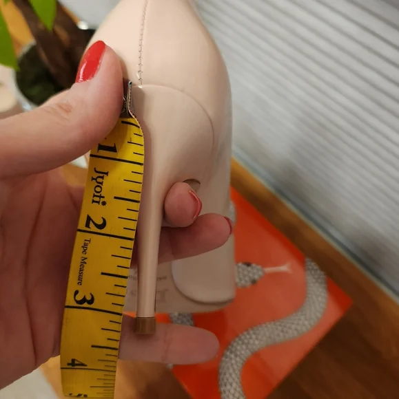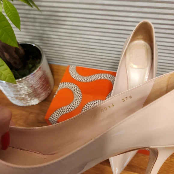 True to size 37.5 or 7.5 . insole measures 9 3/4 inches long. shoes are medium-width, almost medium wide. They don´t fit my foot , and we´re worn only once ! On the bottoms, you will see the residue from thenon-skid tape that has been removed. Heel tips are like new. the is a pin size mark on the tip from storage. you will need a flash light and magnifying glass to see it "-)color is called powder pink the heels are 3 inches sold as is , no box or bag left.color is a very pale Nude- pink