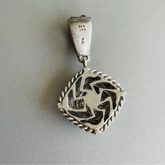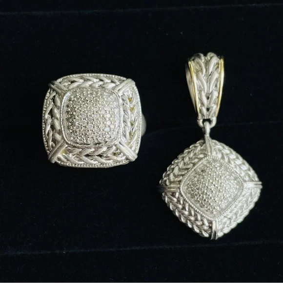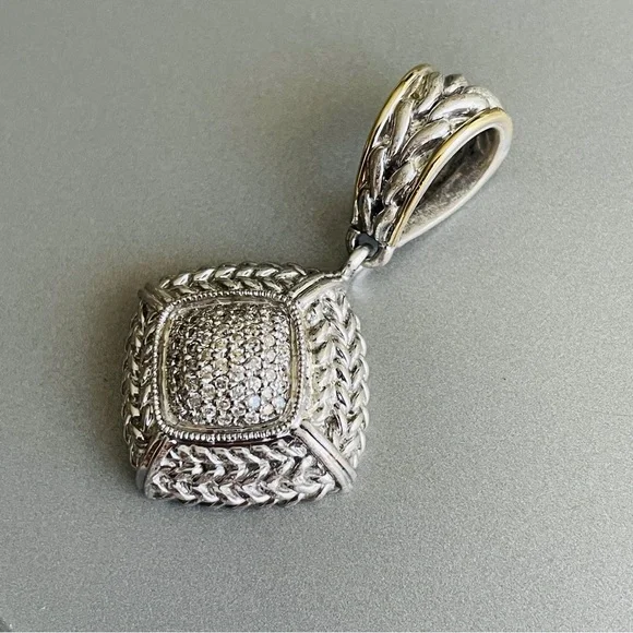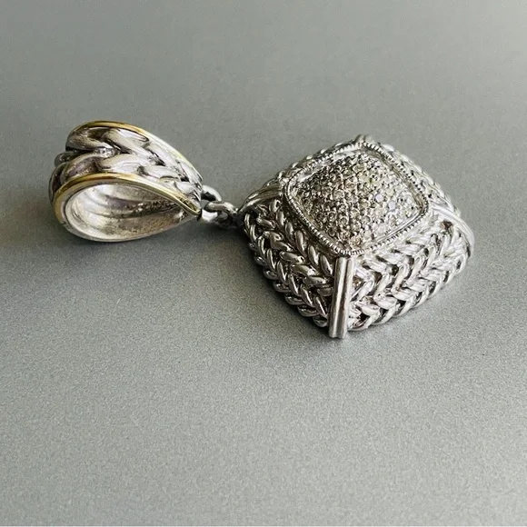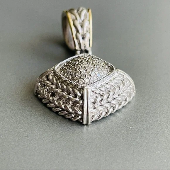 Vintage Gail Scott Sterling 18k Gold Pave Natural Diamond Basket Weave Pendant Necklace Enhancer✦ Metal: solid 925 sterling silver and 18k yellow gold, tested✦ Marked: “925 750”, “S”✦ approximately measures 1.7” (43mm) high including the bail, 0.95” (24mm) wide✦ Weight: 13.9 grams ✦ In good pre-owned conditionA464!!! Matching this beautiful ring I also have Gail Scott ring depicted in the last picture. Please find it among my listings or ask me for details!!!!*VINTAGE NOTE: Please remember that this item has already had a previous life. Therefore, there might be the occasional imperfection.Trifari, vintage, antique, Jensen, Navajo, Kendra Scott, Pandora, trollbeads, sajen, mikimoto, swarovski, tacori, buccellati, taxco, Native American, Zuni, estate, pollack, bisbee, ring, necklace, brooch, bracelet, king baby, Kenneth jay lane, chrome hearts, silpada, Napier, Sarah coventry, krementz, carolee, heidi daus, mejuri, , Agmes, francesca villa, Sophie Brahe, prounis, pariah, erede, jolly bijou, alexis bittar, sauer, alex and ani, Charles garnier, h stern, Anna sheffield, Kramer, hobe, Haskell, eisenberg, schiaparelli,, Carnegie, bogoff, loree rodkin, hatton labs, good art hlywd, Ross Simons, Lagos, monet, Coro, Weiss, Tiffany & co, bvlgari, Cartier, Roberto coin, , Ysl, Dior, Chopard, John hardy, Scott , Konstantino, van cleef, boochier, le vian, Harry Winston, Piaget,