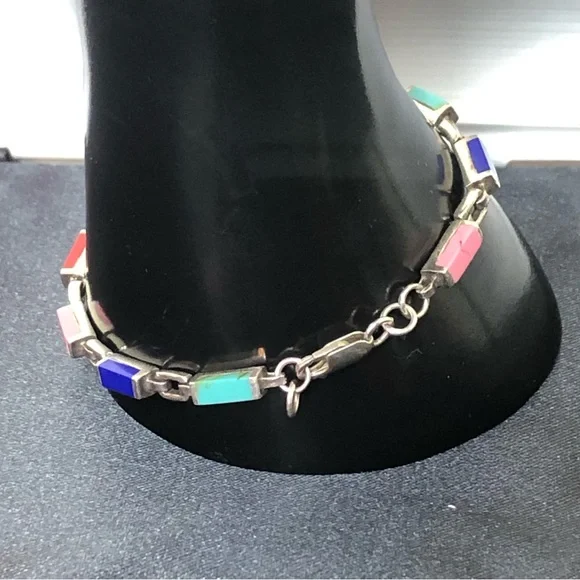 TAXCO Sterling Silver Multi-Gemstone Link BraceletTAXCO Sterling Silver Link BraceletSterling Silver Coral, Lapis Lazuli, Onyx, Turquoise, Jasper and Malachite BraceletCabochon...
