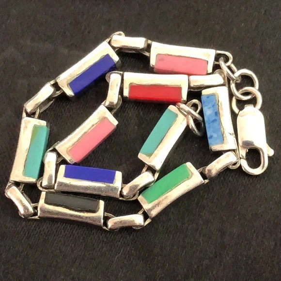 TAXCO Sterling Silver Multi-Gemstone Link Bracelet