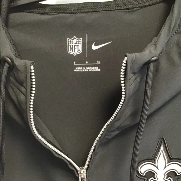 Nike NFL New Orleans Saints Hooded Dri Fit Performance 1/4 Zip Jacket Sz SBrand new with tags. Super comfortable on field quarter zip pull over with stretchy lightweight, dry fit fabric. Men’s small, but could fit a woman our youth as well. Retail for $110.