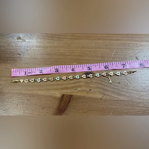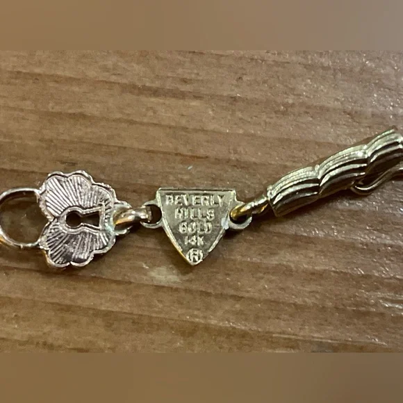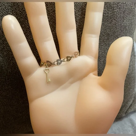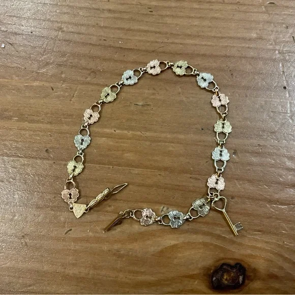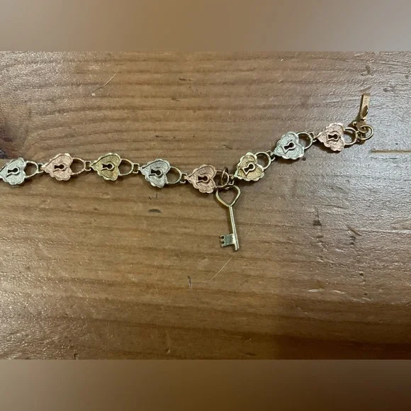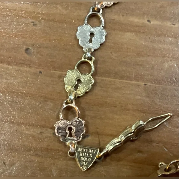 Beverly Hills Gold: 14k vintage tri/color heart locks with dangle key charm bracelet. About/ approximately 7 1/2” inches in length. In perfect preowned conditions. Lever clasp for added security/closure. Sold as is no returns, no refunds, all sales are final no exceptions. Very unique/ classic.