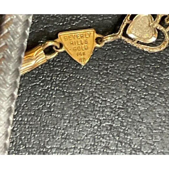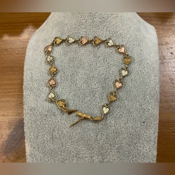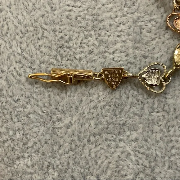 Beverly Hills Gold: 14K. Vintage tri colored gold hearts about/approximately 7” inch tennis design bracelet in preowned standard sold as is no returns no refunds all sales are final no exceptions can wear every day n formal also.