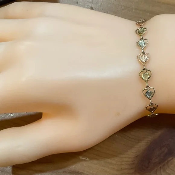 Beverly Hills Gold: 14k.tri colored gold heart shaped tennis 7” inch bracelet.