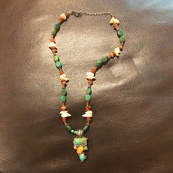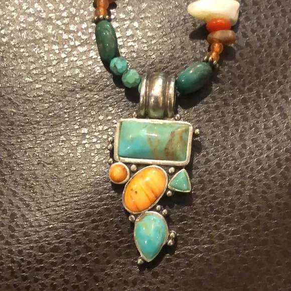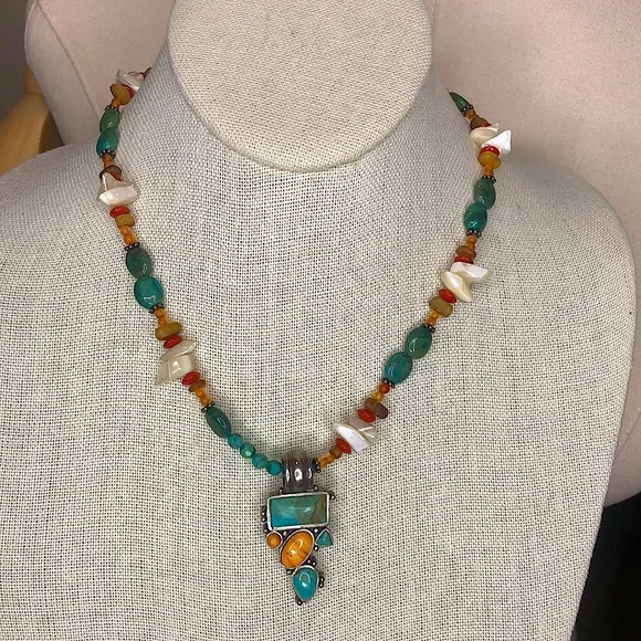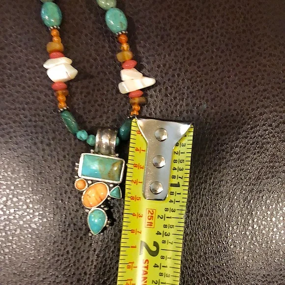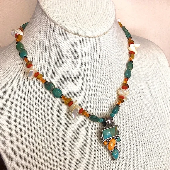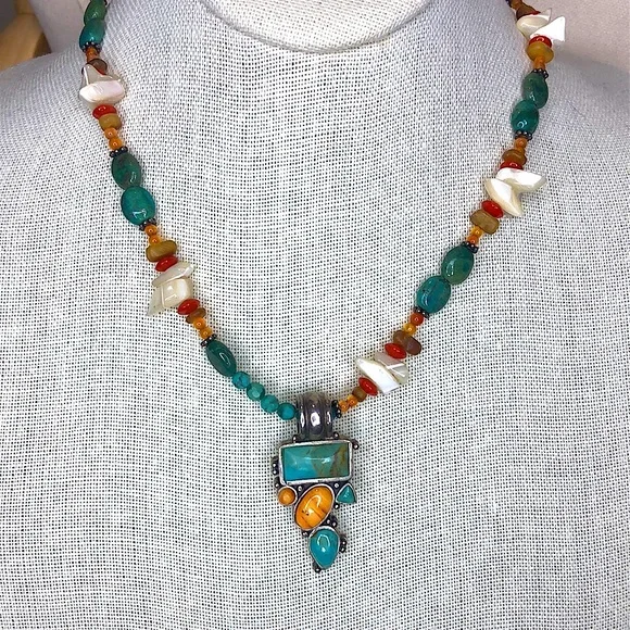 BARSE Sterling Silver 925 Pearl Turquoise Coral Spiny Oyster Inlay Necklace and Pendant VINTAGEVintage BARSE Necklace and PendantTurquoise Coral Spiny Oyster Mother of...