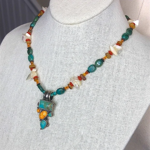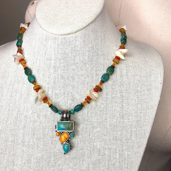 BARSE Sterling Silver Pearl Turquoise Coral Spiny Oyster Necklace & Pendant VTG
