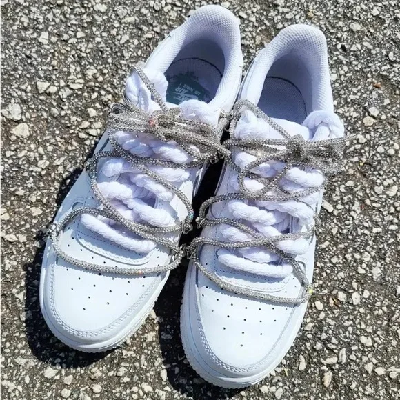 Brand new in original box Custom made to order Bling silver laces (also available in gold)Double lacesYouth sizes converted to womens Select size in womens shoes