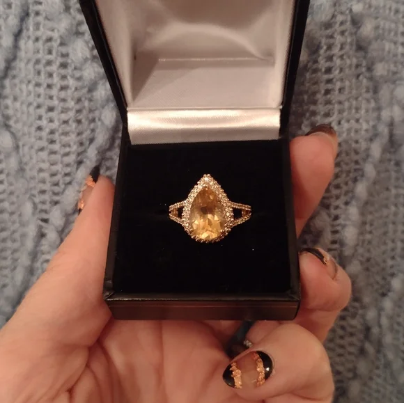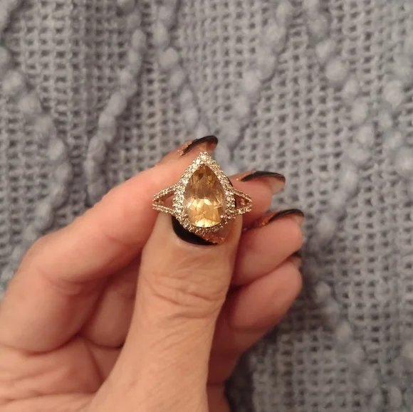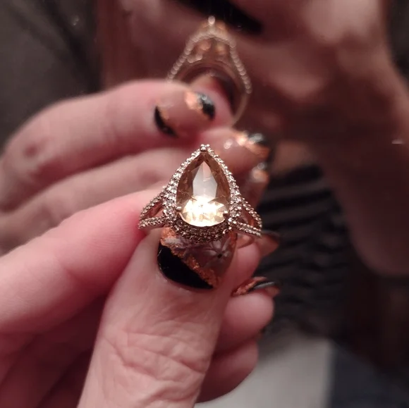 * 14kt stamped - just had it tested by a jeweler for authenticity* It was purchased online years ago and was sold to me as a morganite and diamond ring* Great condition, but there are a couple of issues that I tried showing in the photos. There is one diamond missing up near the point of the tear drop. (one could probably be removed from the underside to replace it.) Also, the bottom of the large stone has a tiny knick in it.* There are a total of 110 small diamonds* The main stone measures 6mm X 10mm* Size is approx. 6.25, but could easily be resized by a reputable jeweler* Split shank* Comes with ring box* Please ask all questions before purchasing* More photos can be added upon request* Thanks for your interest!