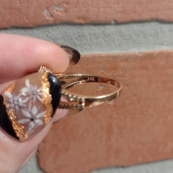 * 14kt stamped - just had it tested by a jeweler for authenticity* It was purchased online years ago and was sold to me as a morganite and diamond ring* Great condition, but there...
