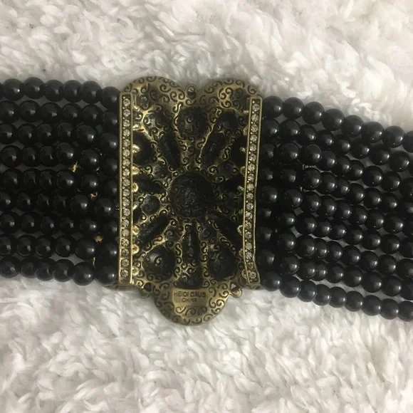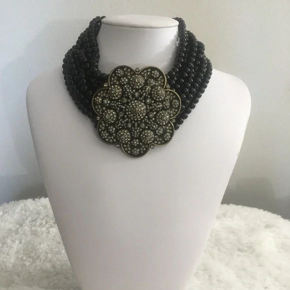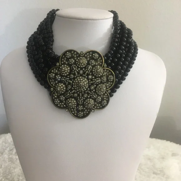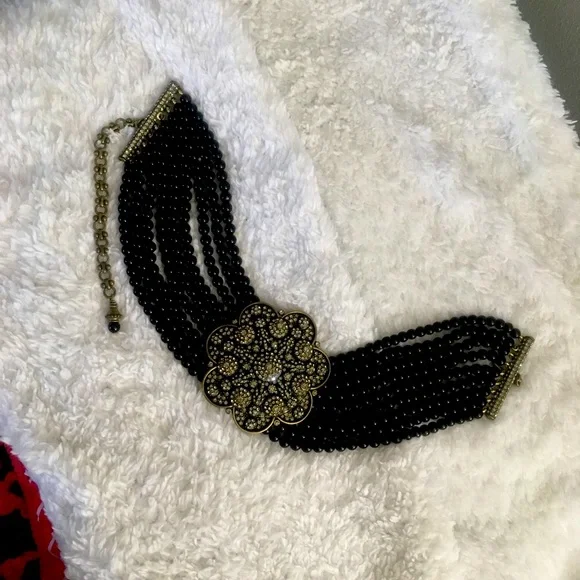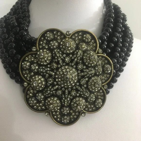 Absolutely Beautiful Heidi Daus Black Diamond Swarovski Crystals Flower Shape Center Black Onyx Beaded Choker, with 4 inch extender chain! This is a Gorgeous, Antique Gold Brass necklace with shiny smooth black onyx beads and a 2.75 inch pop up flower shape center! Classy, Elegant! 16 Years Old, but never used. Perfect for any occasion! Very well made! Flawless!Simple yet attractive! Makes a Perfect Unique Gift! Signed Heidi Daus China in the back.
