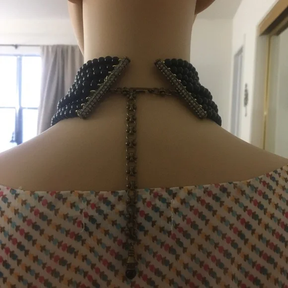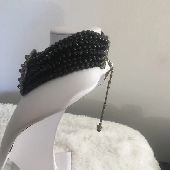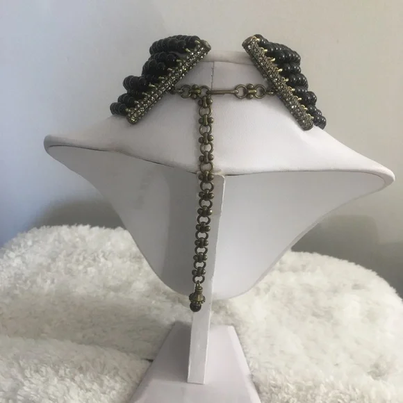 Absolutely Beautiful Heidi Daus Black Diamond Swarovski Crystals Flower Shape Center Black Onyx Beaded Choker, with 4 inch extender chain! This is a Gorgeous, Antique Gold Brass...