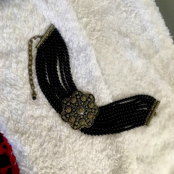 Absolutely Beautiful Heidi Daus Black Diamond Swarovski Crystals Flower Shape Center Black Onyx Beaded Choker, with 4 inch extender chain! This is a Gorgeous, Antique Gold Brass necklace with shiny smooth black onyx beads and a 2.75 inch pop up flower shape center! Classy, Elegant! 16 Years Old, but never used. Perfect for any occasion! Very well made! Flawless!Simple yet attractive! Makes a Perfect Unique Gift! Signed Heidi Daus China in the back.