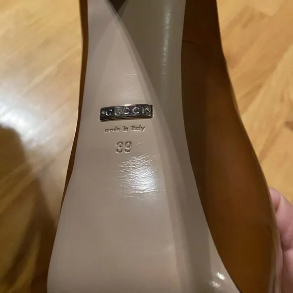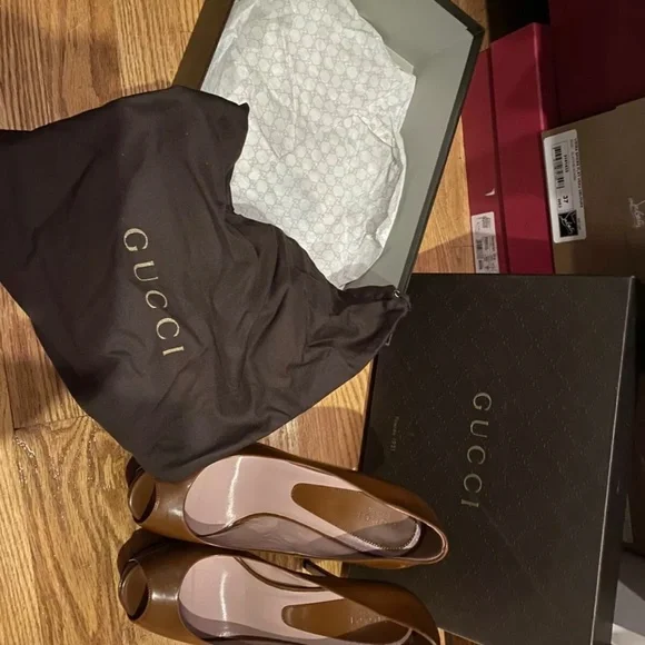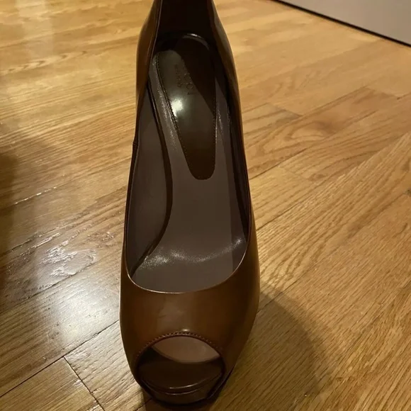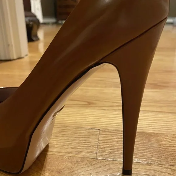 100% authentic - NIB never worn, open toe, tan stilettos. Beautiful soft leather. Size 39