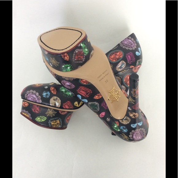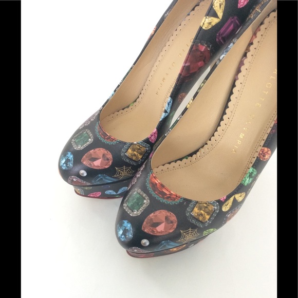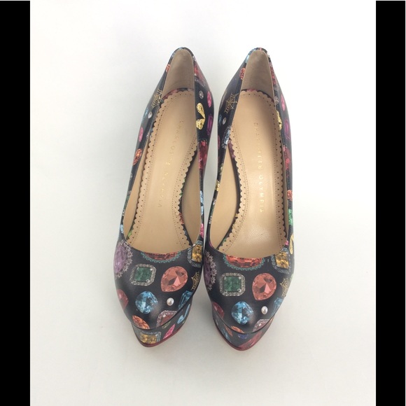 Charlotte Olympia Dolly Heel - In perfect NWT condition and as always, guaranteed authentic!Comes new in box with dustbag.*Black*Calfskin*Jewel print*Gorgeous*Slip on*6.5 inch heel*1 3/4 inch platform*MSRP $895