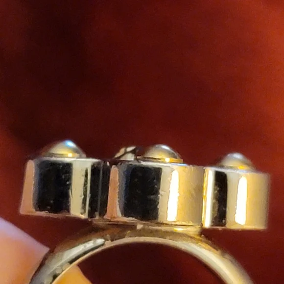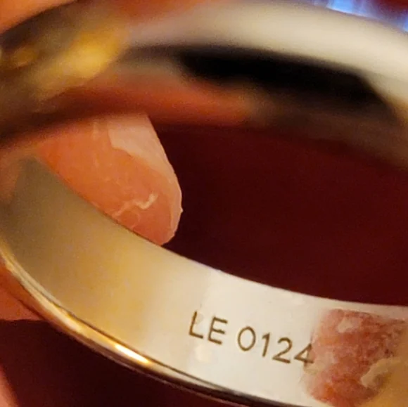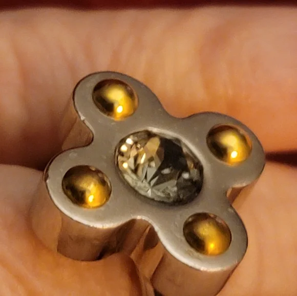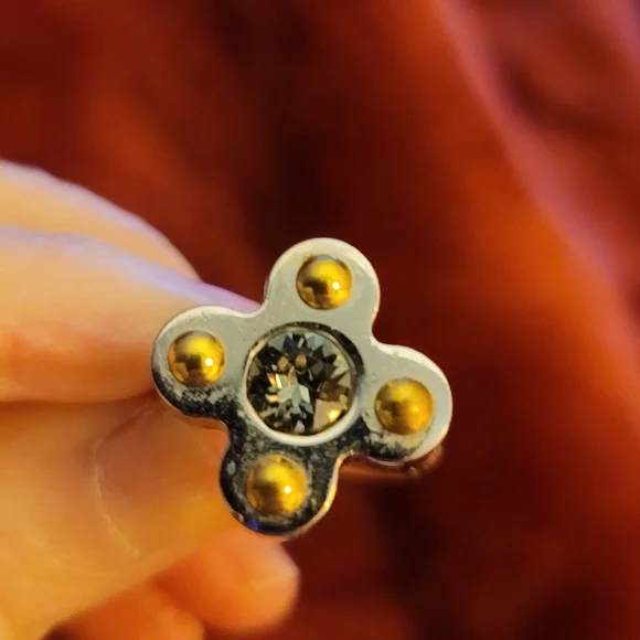 This is an authenticLOUIS VUITTON Love Letters Timeless Ring Set in size S. This chic ring is silver-plated quatrefoil and gold plated fleur, m from the Louis Vuitton monogram and and features a central cut gem with brass or silver studs on each of the rays of the four-sided shapeNo tradesGorgeous My personal piece