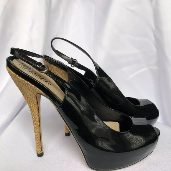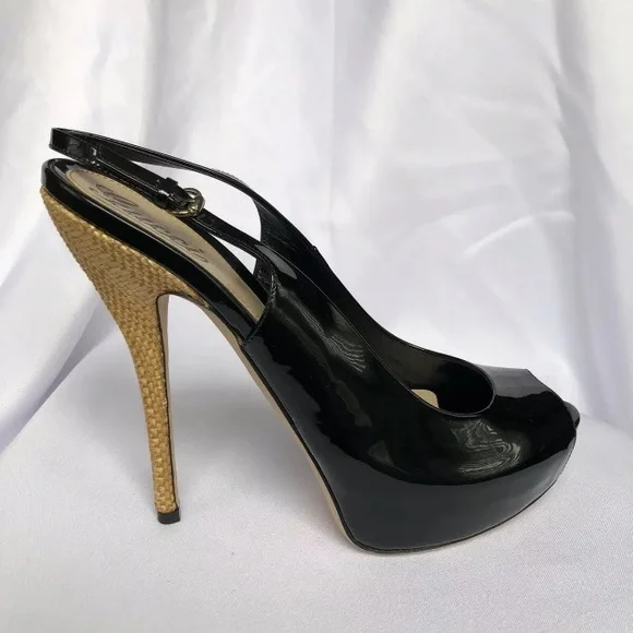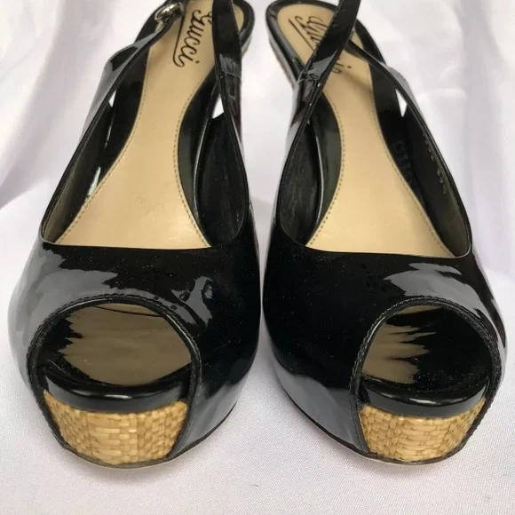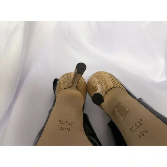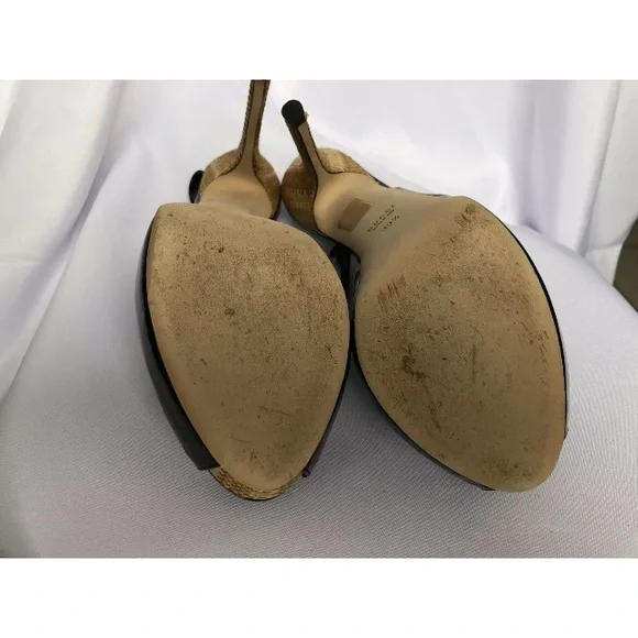 Retail $695Black Patent Leather UpperLeather soleWoven straw heel and peep toe detailPlatformMade in ItalyShipped with original duster bag and a set of replacement heel tips.No...