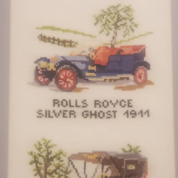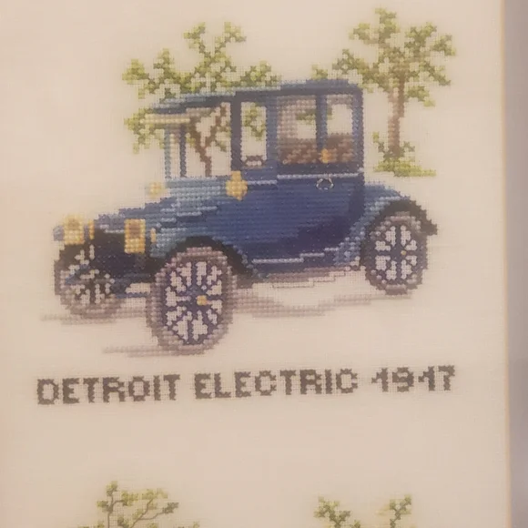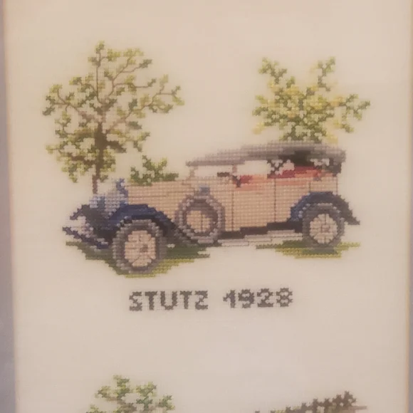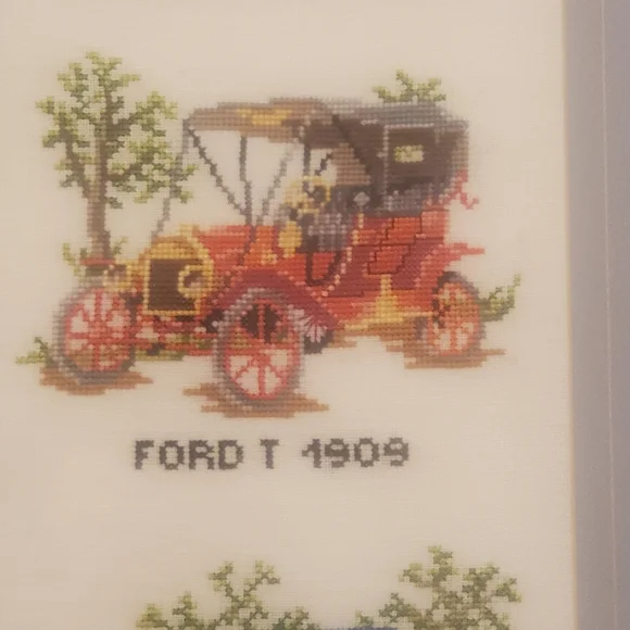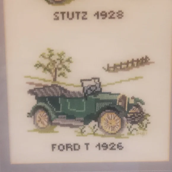 Vinrage Cross Stitch Antique Cars Framed Art. 12" by 36"