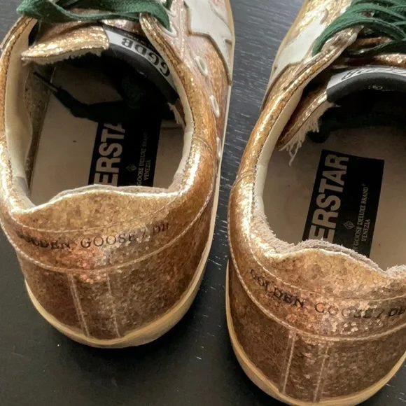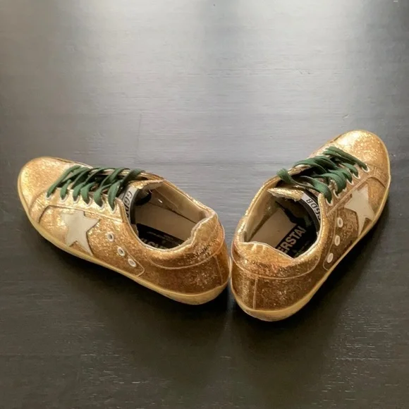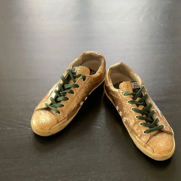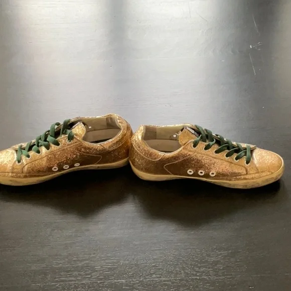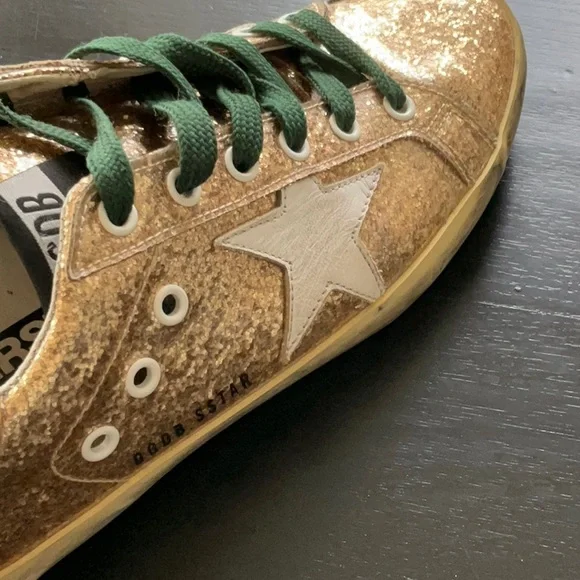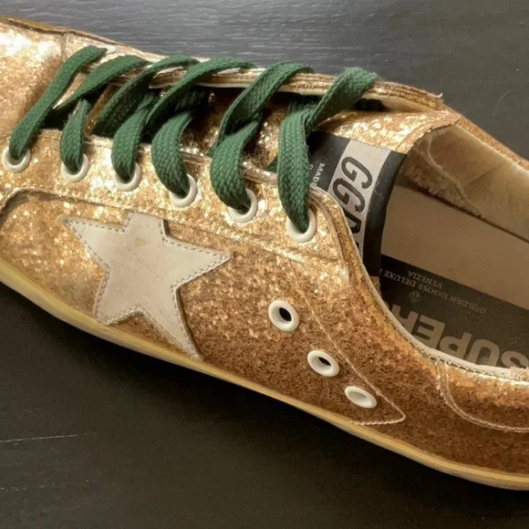 Golden GooseGold Glitter SneakerSuperstarGreen LacesSize 38These are coated glitter Preloved.Super StarAuthentic.Comes with box and bag