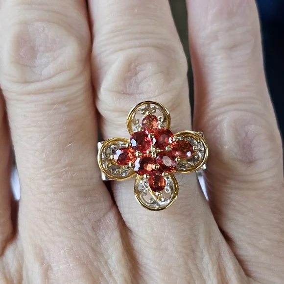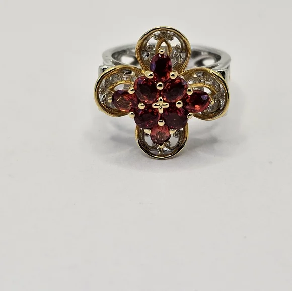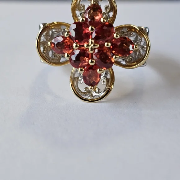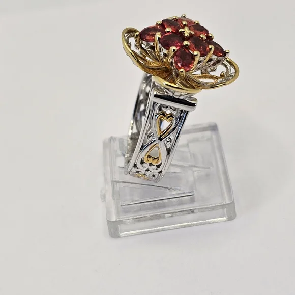 Gorgeous red sapphires are so vivid and vibrant in color.The setting is unique and looks like a cross. There is 18k yellow gold framing around the edges. The remainder is made of high-quality palladium sterling silver. Designed by Michael Valitutti for his Gems En Vogue collection. Size 7! Signed NH 925***Michael Valitutti designs jewelry under the brand name Gems en Vogue, which features European-inspired pieces with genuine gemstones set in sterling palladium alloy and 18K gold. His jewelry is inspired by art movements like Art Deco and the French Renaissance. Valitutti has a graduate Gemologist diploma from the Gemological Institute of America (GIA) and has worked in the jewelry industry since 1980. He has presented gems on ShopHQ, TSC Canada, and TVSN Australia.