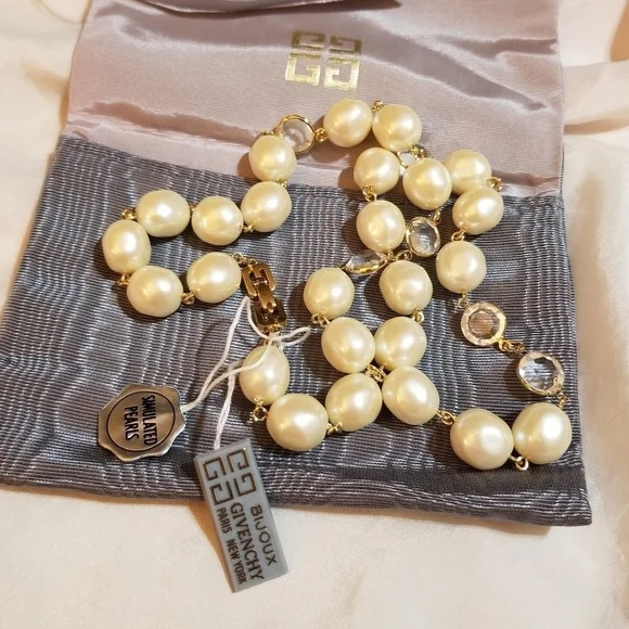 I had 2 of these, the 1st one sold, this is THE LAST ONE. Beautiful Vintage, Never Worn, In NEW Condition, Designer signed Givenchy Paris New York Bijoux Simulated Baroque Pearls, Swarovski Crystals Necklace. Has original hang tags and dust bag. Measures 24" long with faux Baroque pearls measuring 14mm long and 10mm bezel set Swarovski Crystals. The clasp is hallmarked Givenchy Paris New York and Givenchy on each G of the double G clasp. You´ll love this Classic Exquisite Beauty. Item G51. I´ve been in Vintage/Antique jewelry for over 35yrs. Please feel free to ask questions. MY LISTINGS GENERALLY CONSIST OF MANY ONE OF A KIND OR VERY RARE PIECES, SOLID 14KT ITEMS, STERLING SILVER, VINTAGE AND ANTIQUE PIECES, BOLD AND RUNWAY-ERA. DESIGNERS SUCH AS GIVENCHY PARIS NEW YORK, CHRISTIAN DIOR FRANCE, FENDI ITALY, VALENTINO, KENNETH JAY LANE, , ALEXIS BITTAR, YVES SAINT LAURENT, HENRI BENDEL, HERMES, JUDITH JACK, KATE SPADE, MICHAEL KORS, MIRIAM HASKELL, CORO AND MORE.