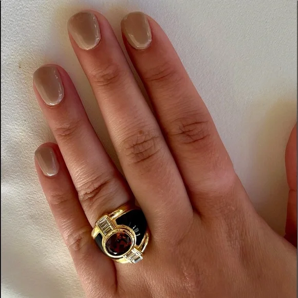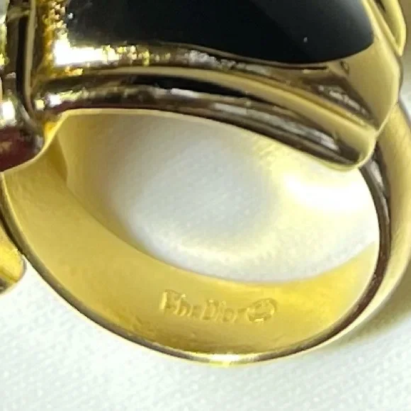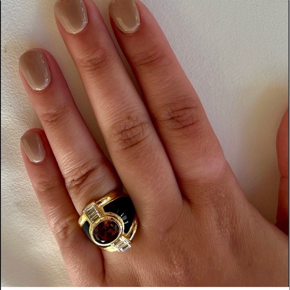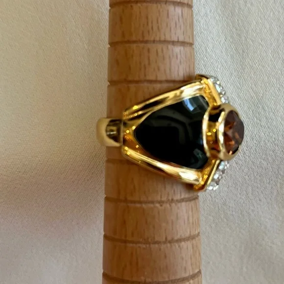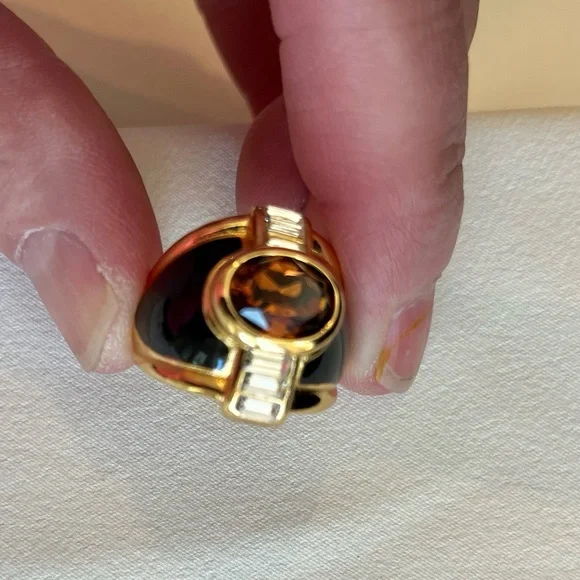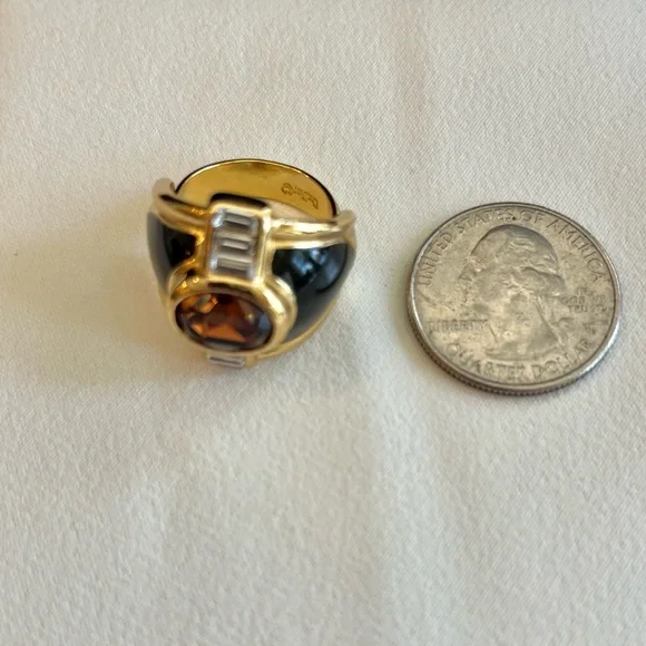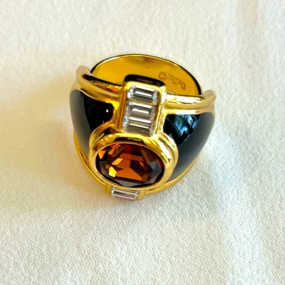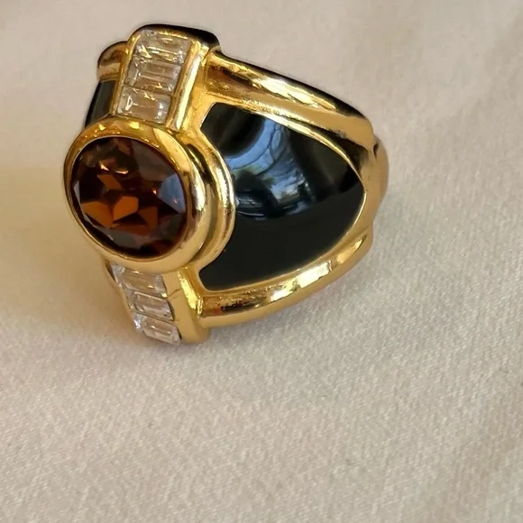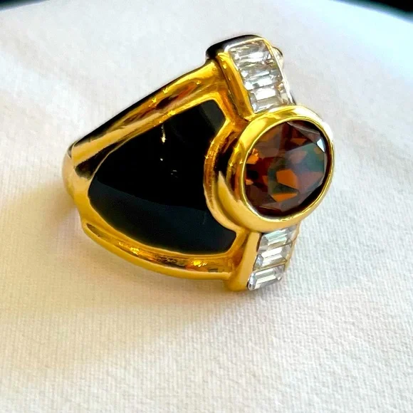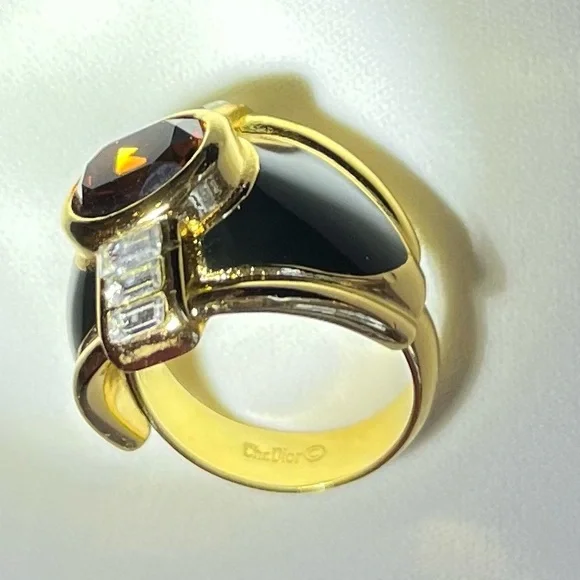 This Christian Dior gold plated cocktail ring combines fashion stones to simulate topaz, onyx, and diamond baguettes, in this powerfulstatement ring. While ring is currently set...