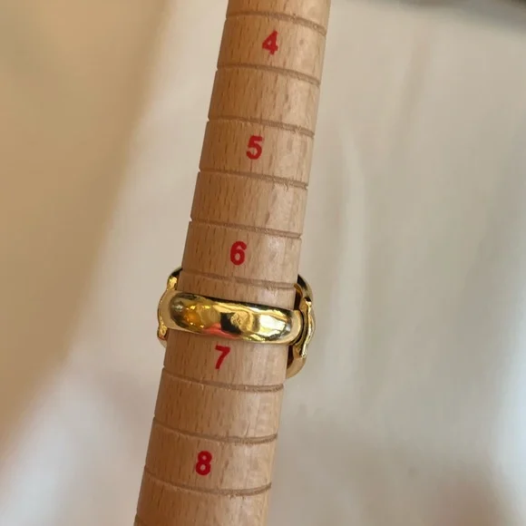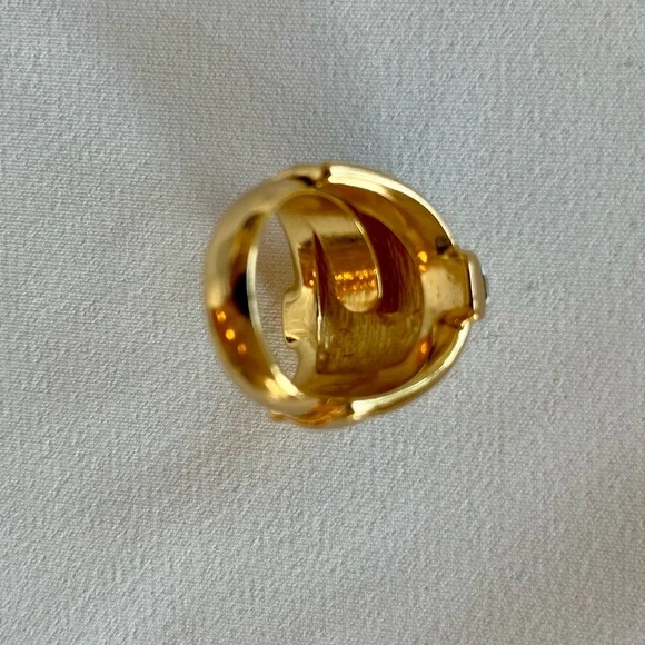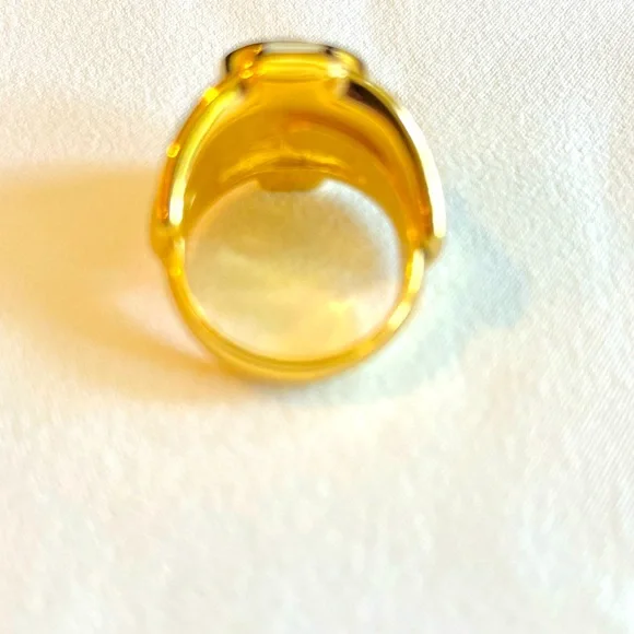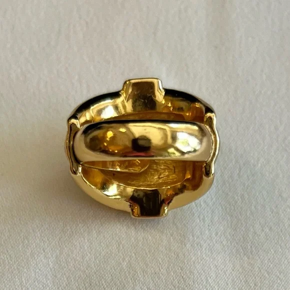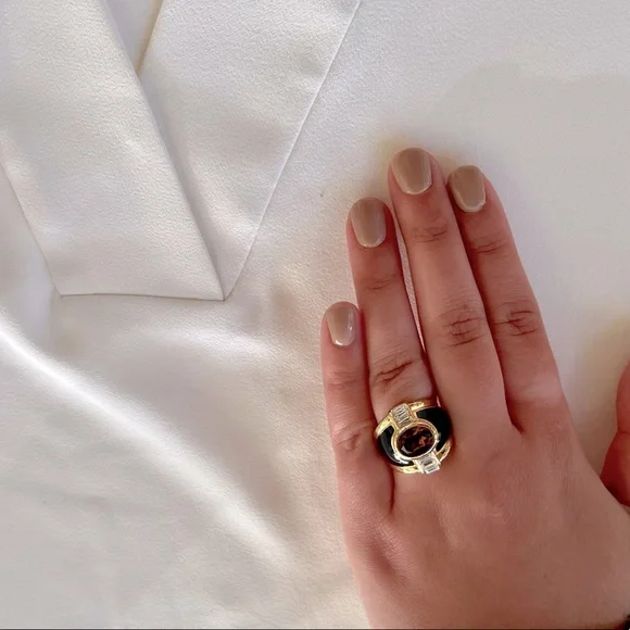 This Christian Dior gold plated cocktail ring combines fashion stones to simulate topaz, onyx, and diamond baguettes, in this powerfulstatement ring. While ring is currently set at size 6.5, adjustable band will flex to fit multiple sizes (visible in photos 6-7). Designer logo stamp visible in photos 8-9. Ring is in pristine condition, like brand new and never been worn.*Remember to bundle and save on shipping!