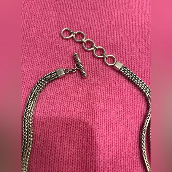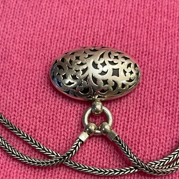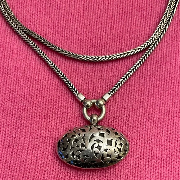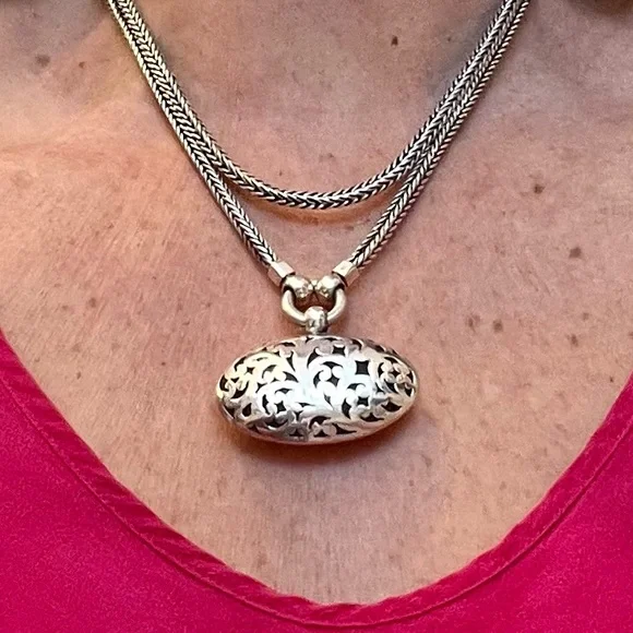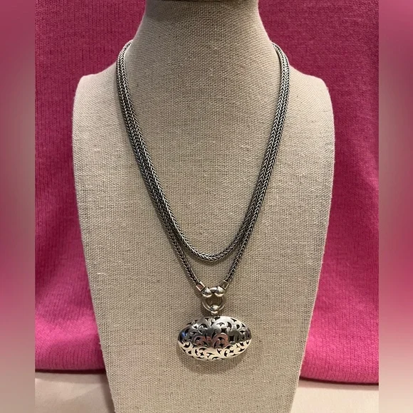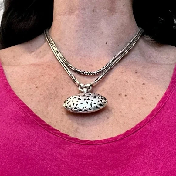 This vintage Lois Hill double strand herringbone necklace hosts an oval scroll cut out medallion charm, all from 925 sterling silver, with toggle closure. Necklace strands are 15” snd 16”, and charm is 4cm wide x 5 1/2cm long. Charm is scroll cut on both sides, as shown in photos #8-9.Designer signature stamped as shown in photo #12.925 sterling and Indonesia stamp shown in photo #13. Sterling silver necklace weighs 68.32 grams as shown in photo #14. Necklace is an excellent, like new condition. *Please remember to bundle your purchases, and save on shipping!