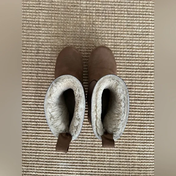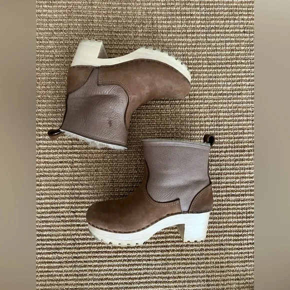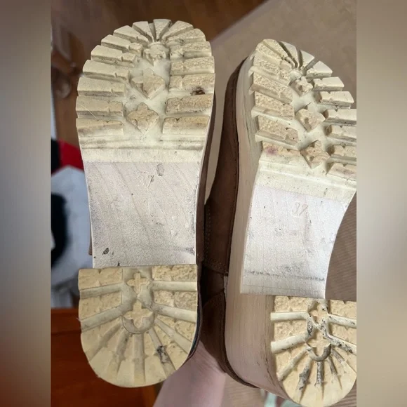 Worn a few times but selling because I bought a size too small for my feet. See details from No. 6´s website below:Fully lined shearling boot with honey nubuck toe, heel cap, and back tab. 5" tall shaft can be worn up or rolled over. Lacquered high-heel base adds style without sacrificing walkability or comfort. Can be worn with or without socks. Every clog is handmade.Comes from a pet-free, smoke-free home.