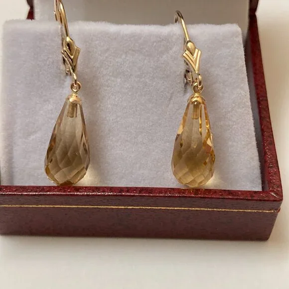 14K Yellow Gold Citrine Earrings Briolette Cut Dangle
