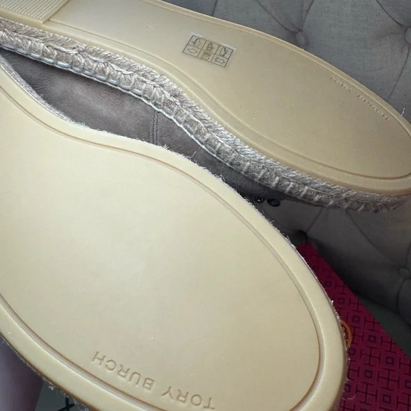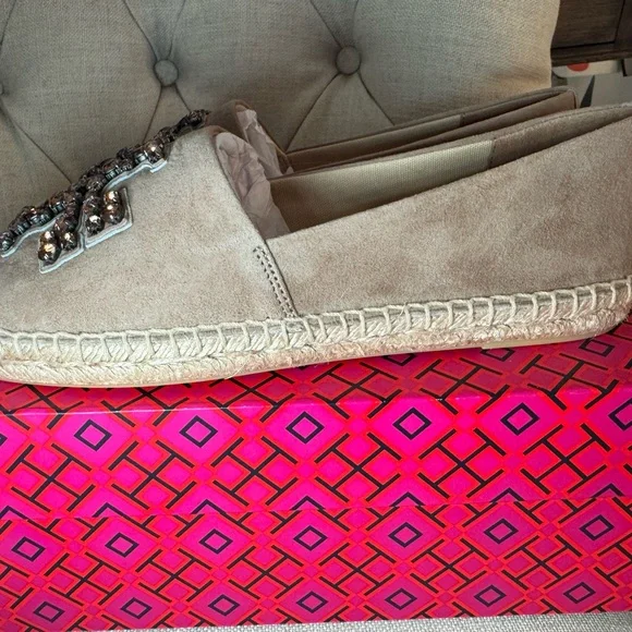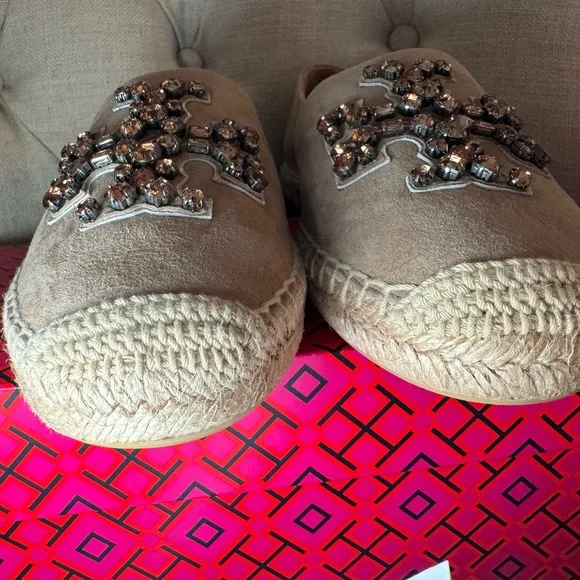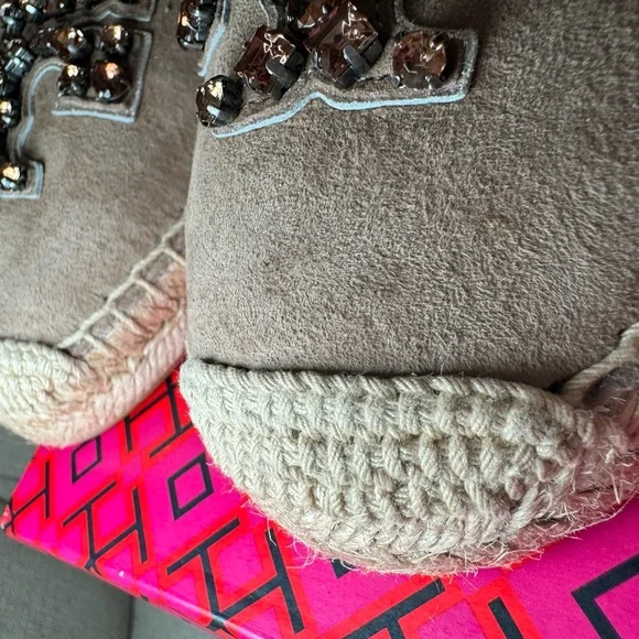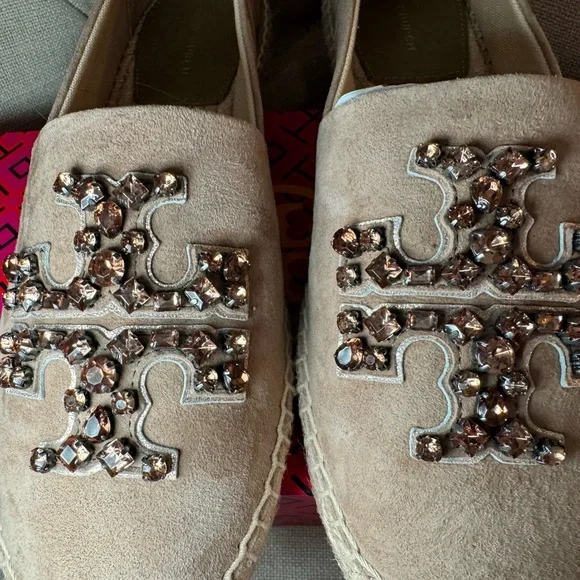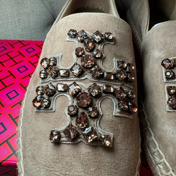 • Beautiful Almond Flour color with prong-set crystals• Features hand-applied jewels on a raised double-T logo• Canvas lining with a comfortable jute footbed and durable...