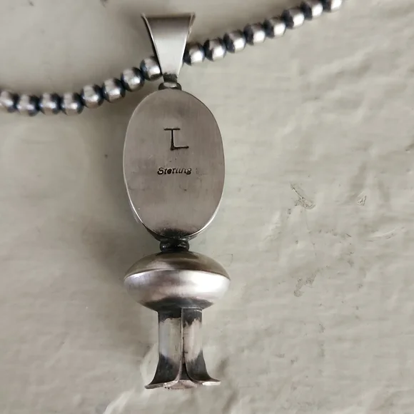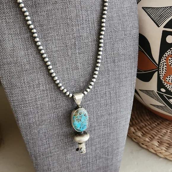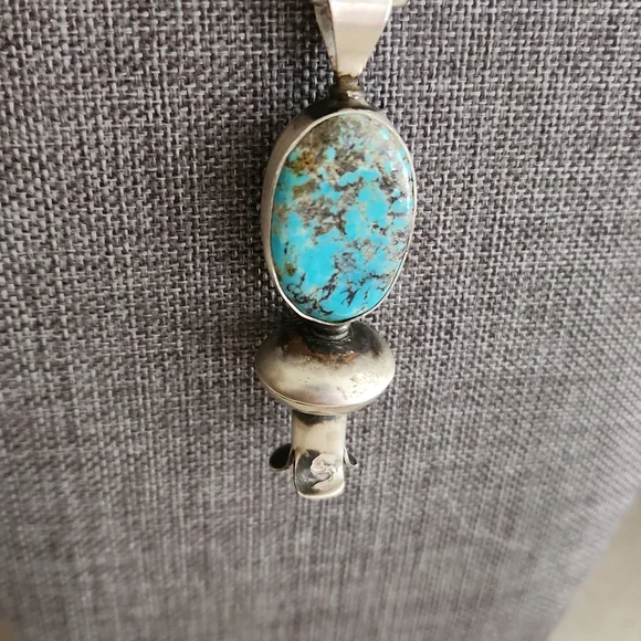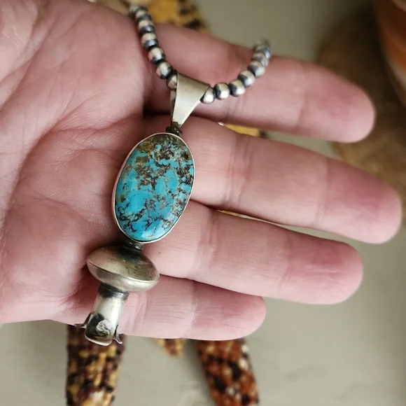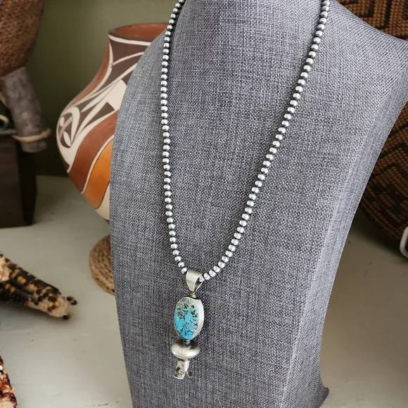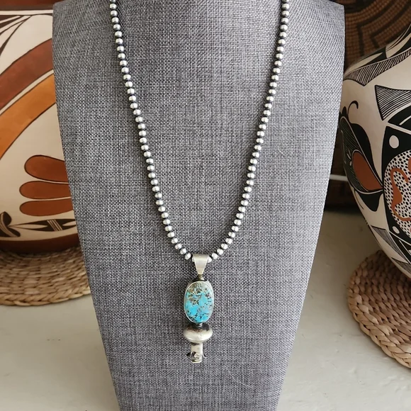 Stunning Native American Navajo Pearls and squash blossom pendant are in new never worn condition. Pearls are marked sterling and measure 4mm and 18" long. Pendant measures approximately 2 1/2" from top of bale to base. Gorgeous natural Kingman stone with sterling blossom at bottom. Pendant is marked sterling and signed by artist on back. A gorgeous SW handmade collectible necklace to highlight your perfect outfit! From non-smoking home.