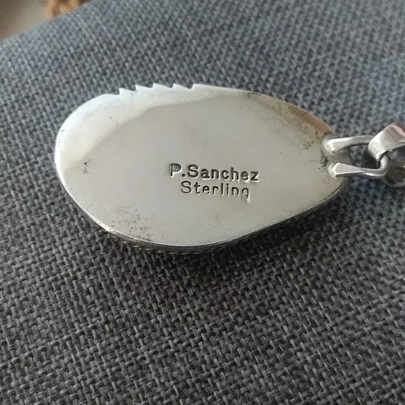 Beautiful Navajo Dry Creek turquoise pendant and sterling large link chain. Gorgeous light pale collectible Dry Creek Mine turquoise stone with brown inclusions. Very pretty stone! Pendant is marked on back by artist, P. Sanchez and sterling. Substantial chain is approximately 23". Pendant measures approximately 1 1/2". From non-smoking home.